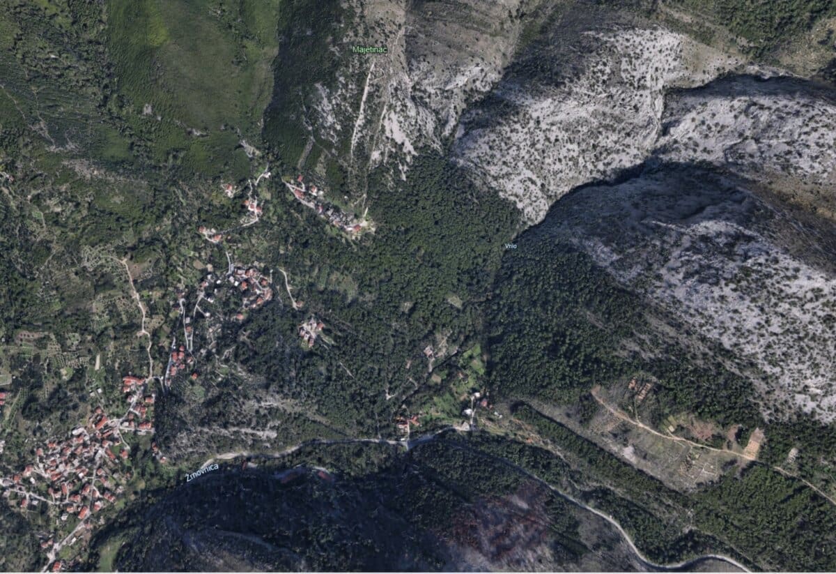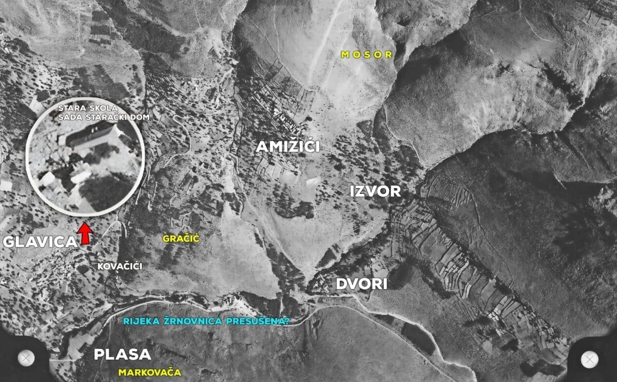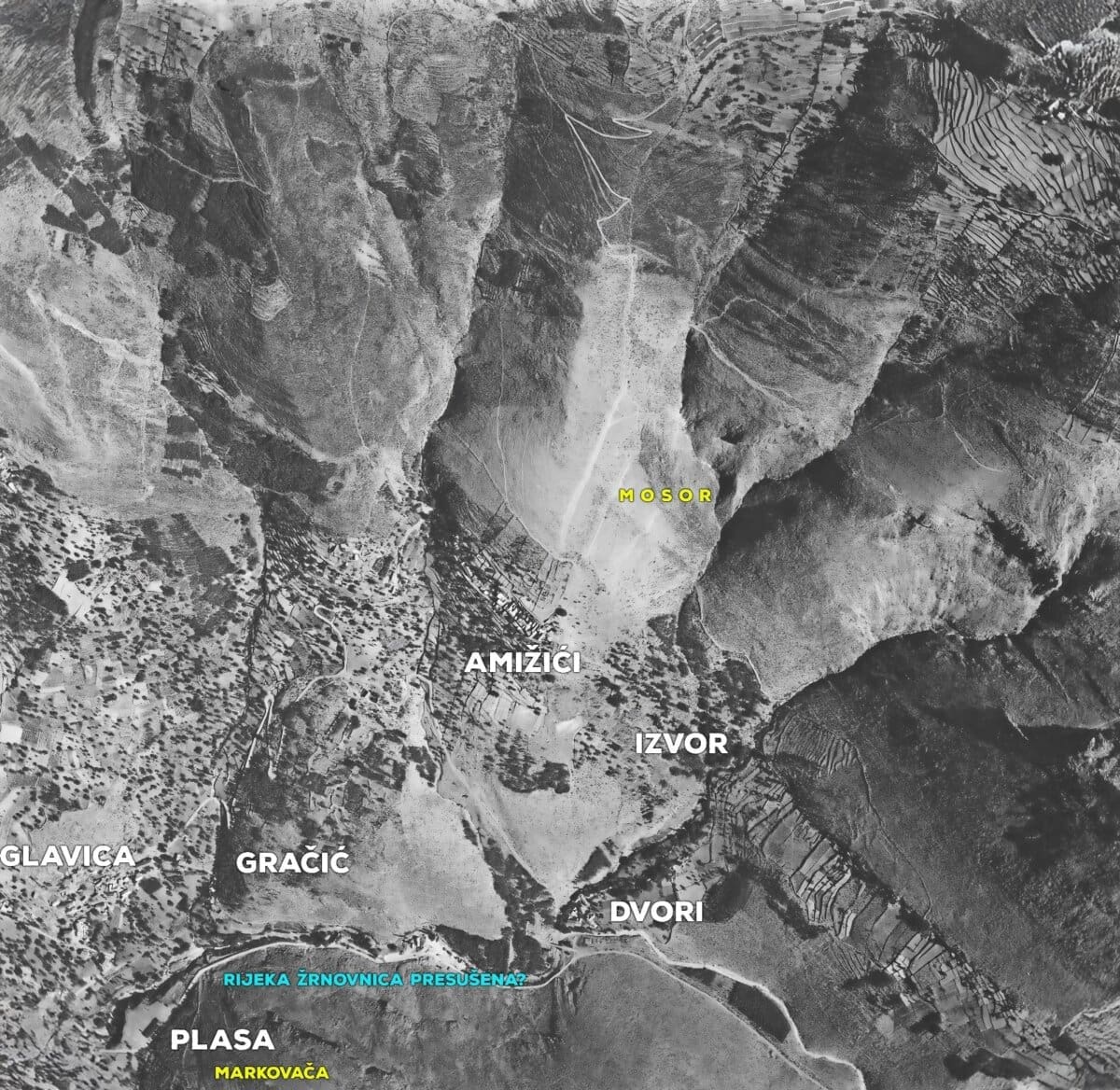 Vrijeme prije izgradnje brane Prančevići kad je rijeka Žrnovnica redovito presušivala u ljetnim mjesecima. U prilogu u boji je i Google earth prikaz kako bi lakše raspoznali pojedine lokacije", objavili su na ovom portalu.