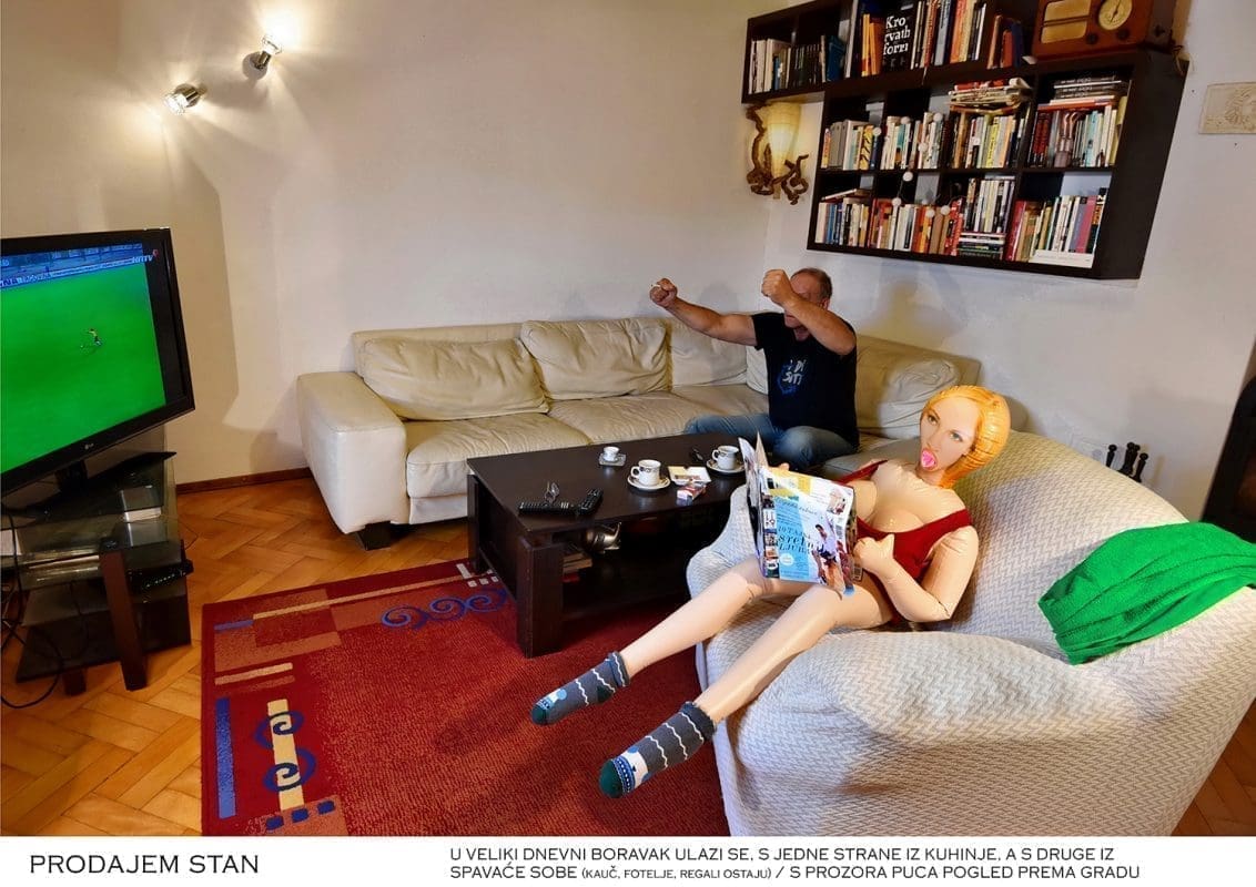 Glavni protagonisti, autor i lutka na napuhavanje, na fotografijama su uhvaćeni u banalnim životnim situacijama, s detaljima koji promatraču često otkrivaju puno više nego što je bila fotografova namjera. Upravo na isti način na koji oglašivači često u svojim oglasima nehotimice razotkrivaju intimu svog doma i svog života. Autor teksta predgovora, uvaženi povjesničar umjetnosti, dr. sc. Zvonko Maković, u svom tekstu naglasak stavlja upravo na dimenziju razotkrivanja ''običnih međuljudskih odnosa kakvi postoje svuda oko nas, iza nekakvih zaključanih vrata'', odnosno, kako Maković ističe – ''Na kraju se moramo zapitati jesu li ove fotografije uopće namijenjene ponudi stana na prodaju, ili je ipak riječ o nečemu drugom. Naravno da se ne radi o reklamnim fotografijama kojima se nudi stan, jer stan je ovdje tek banalni dekor u kome se odvija još banalniji život dvoje apsurdnih i banalnih protagonista lišenih svega ljudskoga. Edi Matić pri tom se ne utjelovljuje u naratora koji drugima otkriva neke istine pune vrijednih osobina. U njegovoj sekvenci prije da otkrivamo dubinu ljudske praznine, a njega kao posrednika koji pomiče zastor i jednu tužnu, svakome blisku svakodnevicu čini vidljivom drugima.''