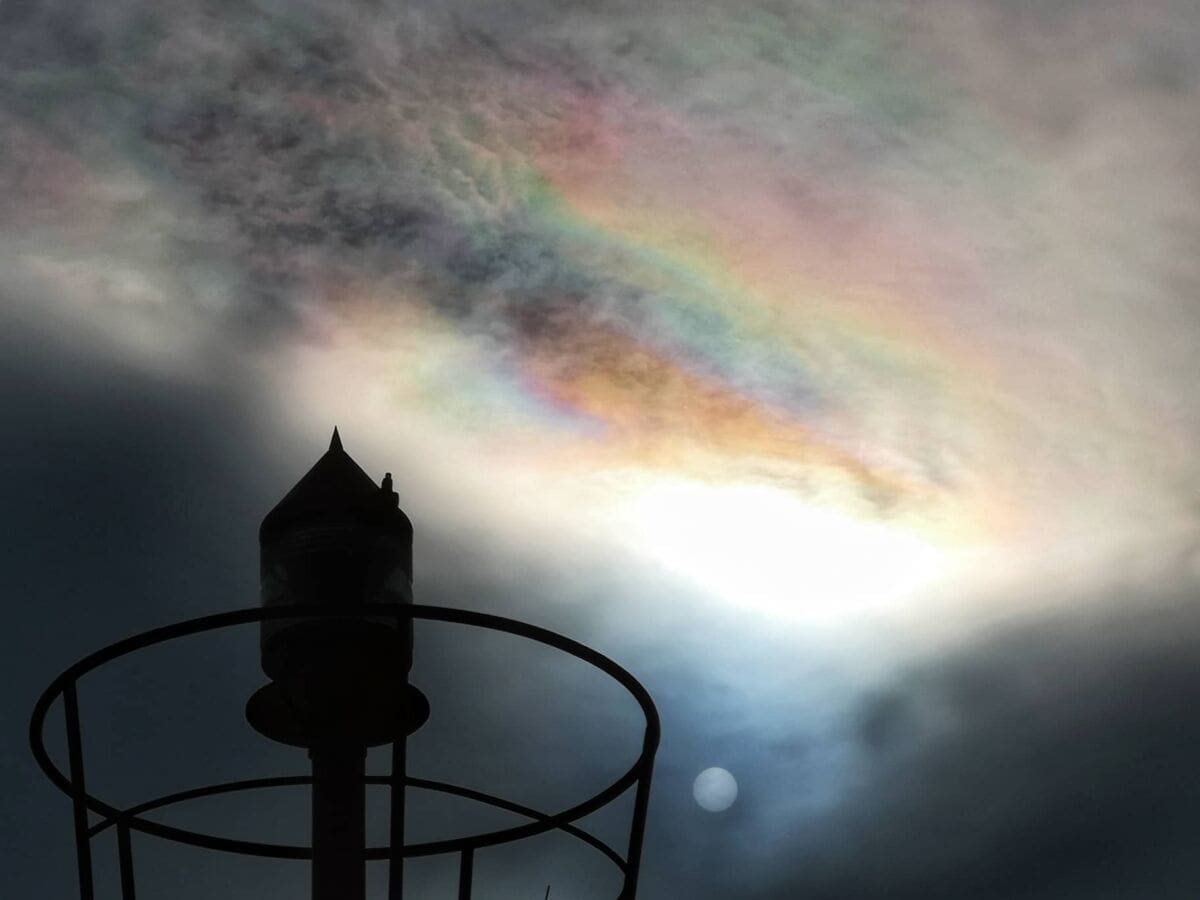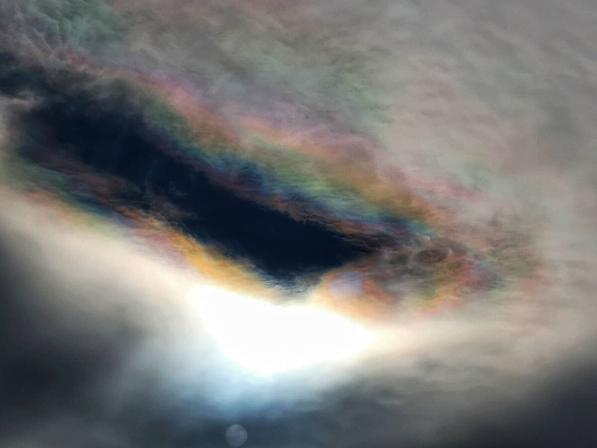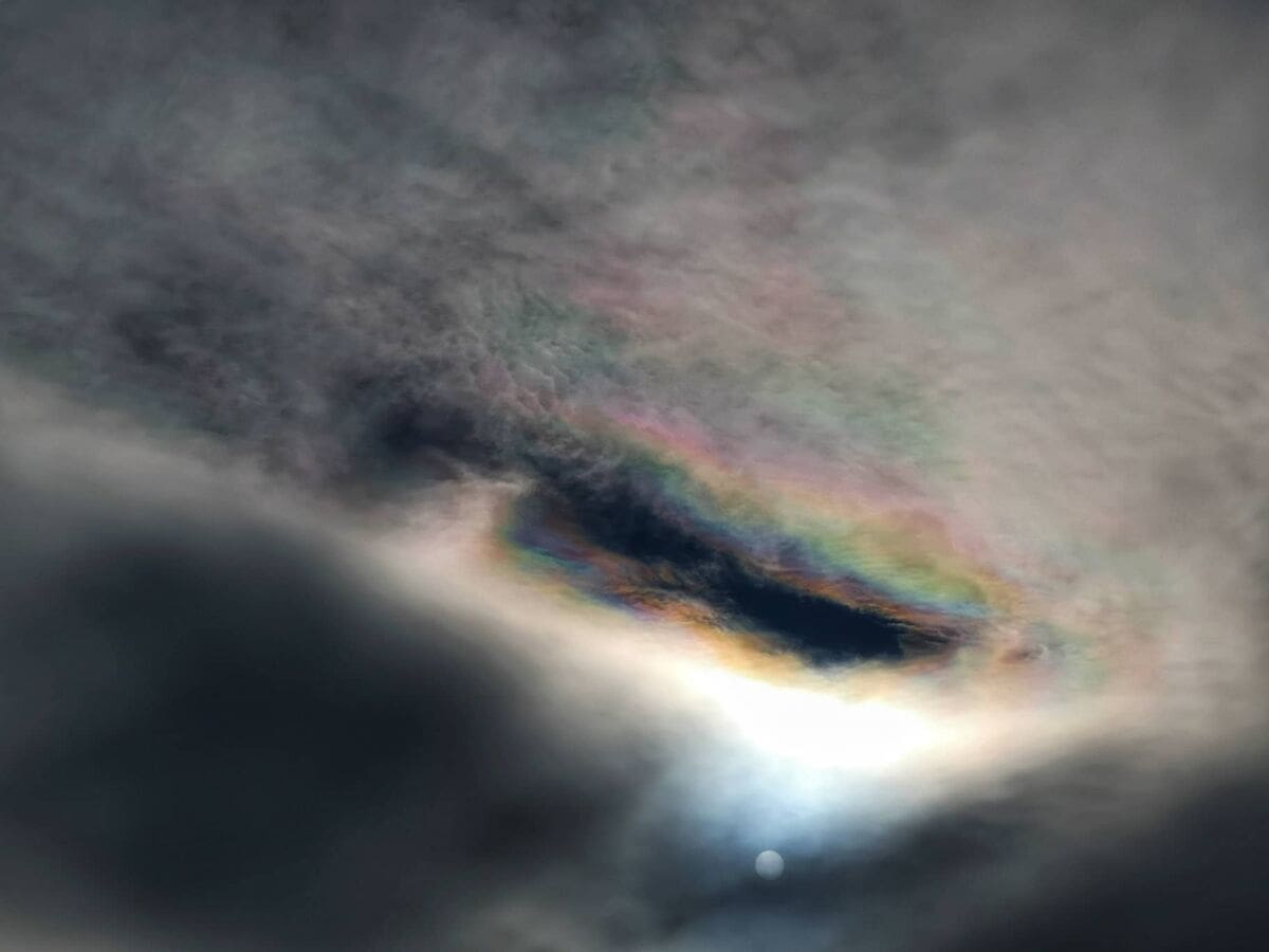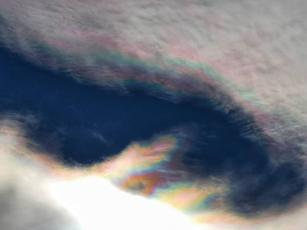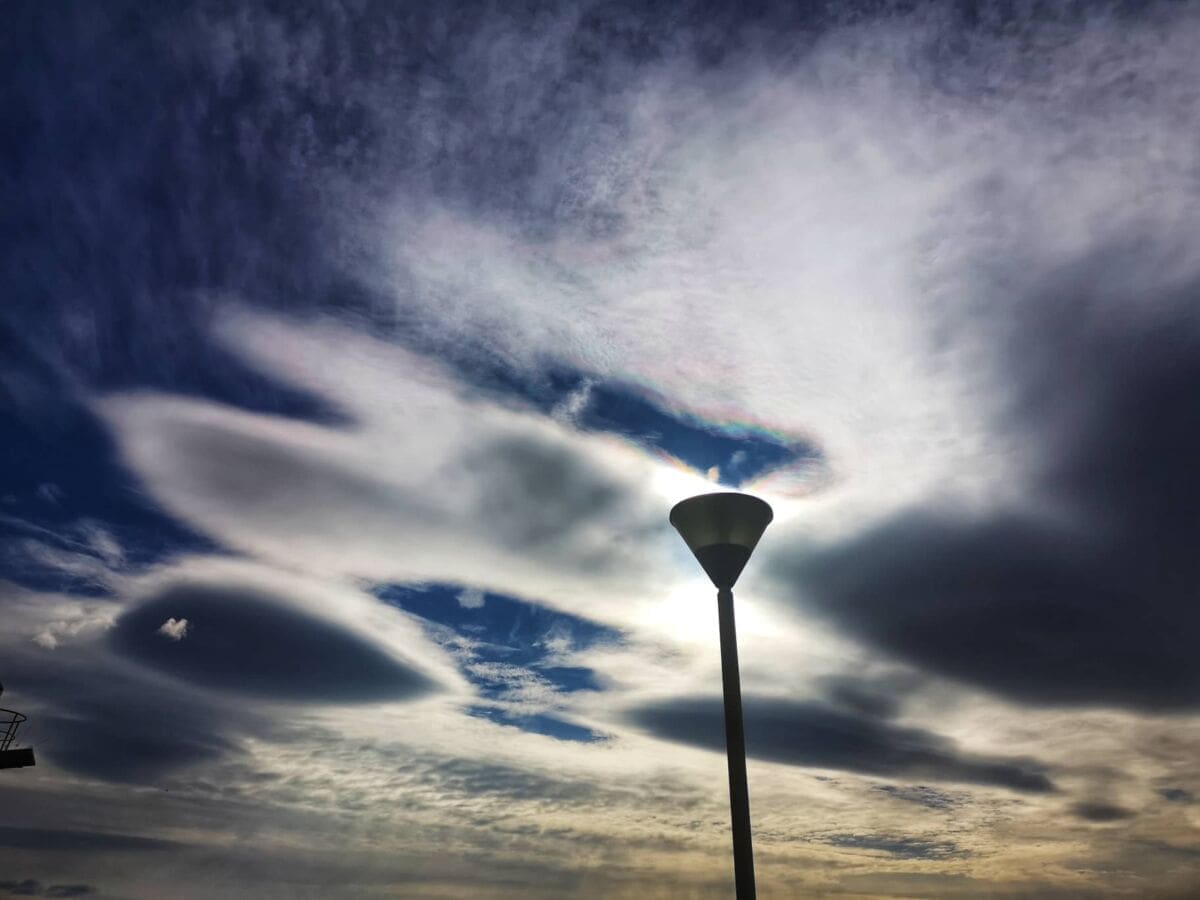 Neno Marušić, osim lentikularisa, jučer je na nebu iznad Baške Vode snimio je optički fenomen. Radi se o iridescentnim oblacima. Lako su uočljivi jer se na njima mogu primijetiti boje slične duginima. Ovi oblaci nastaju u oblacima koji se sastoje od kapljica slične veličine. Iste su veličine kada nastaju masovno i istovremeno, kao što nastaje altocumulus lentikularis. Oblak mora biti manje-više između promatrača i Sunca - čuvajte oči i senzore fotoaparata! Svaku zraku svjetlosti svaka kapljica malo rasprši preko svojih rubova, a ona se ponovo pomješa poslije kapljice i interferira. Rezultat je ili korona ili ako je oblak nepravilnog oblika pregršt koroninih fragmenata.