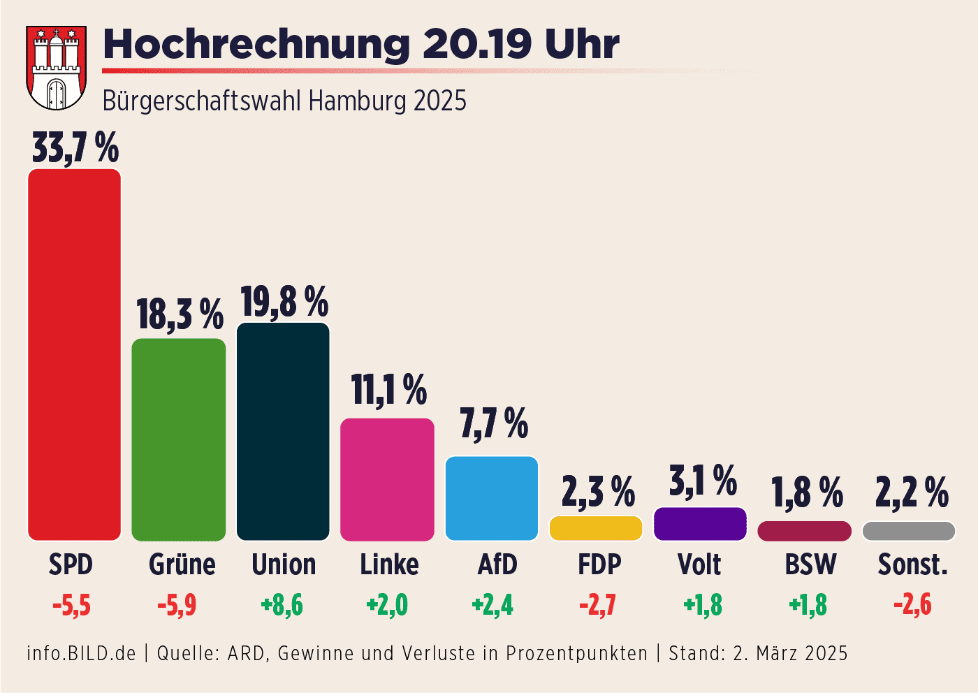U nedjelju su održani izbori u saveznoj pokrajini-gradu Hamburgu, a pobjednu je odnio SPD, usprkos padu potpore u odnosu na izbore prije četiri godine. Gradonačelnik SPD-a Peter Tschentscher vodi s impresivnih 33,7 posto. Ovaj rezultat predstavlja pravi uspjeh nakon što je stranka još tjedan dana ranije doživjela povijesno nisku potporu na saveznoj izbornoj sceni. Međutim, SPD u Hamburgu bilježi pad od gotovo 6 postotnih bodova u odnosu na prethodne izbore za gradsku skupštinu – što je, kako sami priznaju, za njih razočarenje.