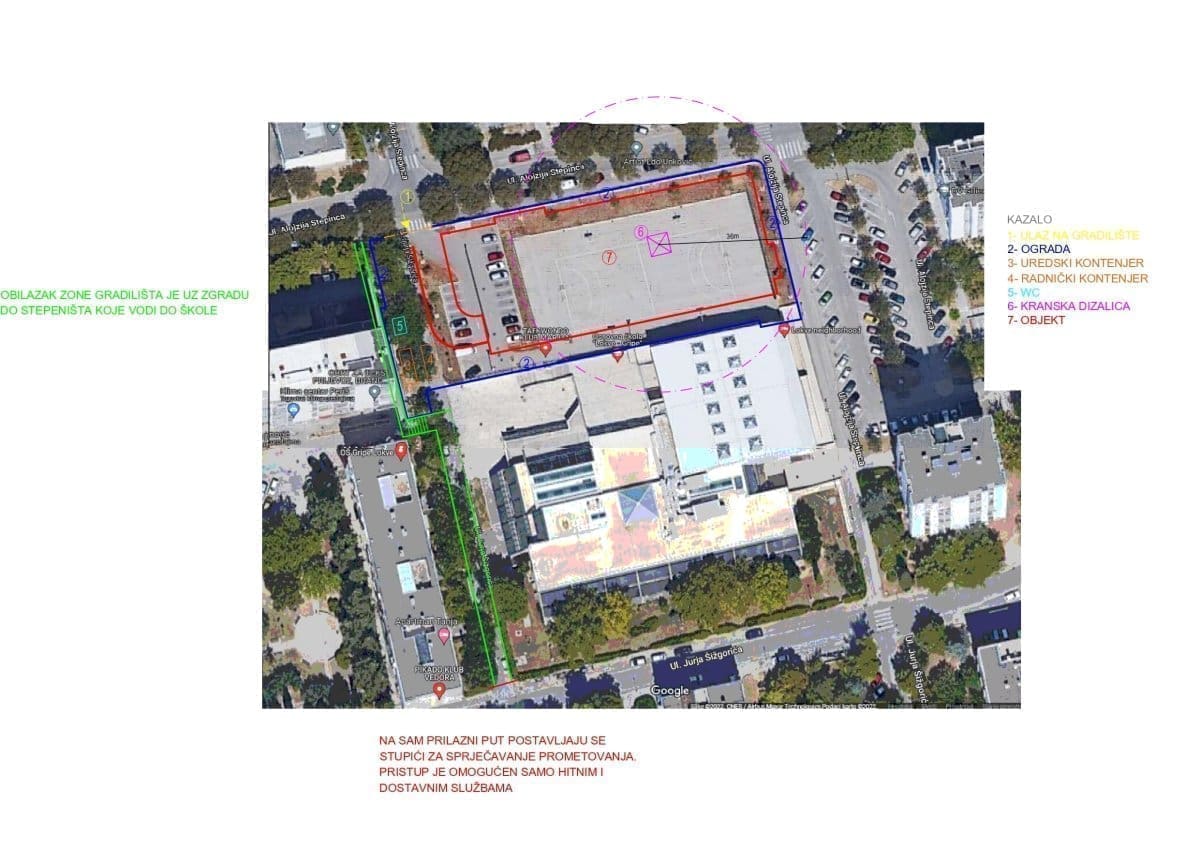 "Za vrijeme trajanja radova, na snazi će biti posebna prometna regulacija. Ulaz na gradilište bit će sa sjeverne strane, iz Stepinčeve ulice, a postojeće parkiralište uz školu, neće biti dostupno jer je u obuhvatu gradilišta. Zbog maksimalne sigurnosti, u potpunosti će se ograditi i pješački prilaz školi sa sjeverne strane sve do ruba zida parkirališta. Obilazak zone gradilišta s te strane bit će uz zgradu do stubišta koje vodi do glavnog ulaza škole. Tim stubištem ujedno se preporuča i dolazak do škole ako se dolazi vozilom. Za pješake, dolazak do glavnog školskog ulaza bit će dostupan i s južne strane postojećeg prilaza, sa Šižgorićeve ulice, na početku kojeg će se postaviti stupići kako bi se spriječio prolazak vozila u pješačku zonu, a pristup će biti omogućen samo hitnim i dostavnim službama", javljaju iz Split parkinga.