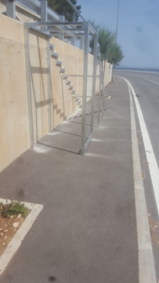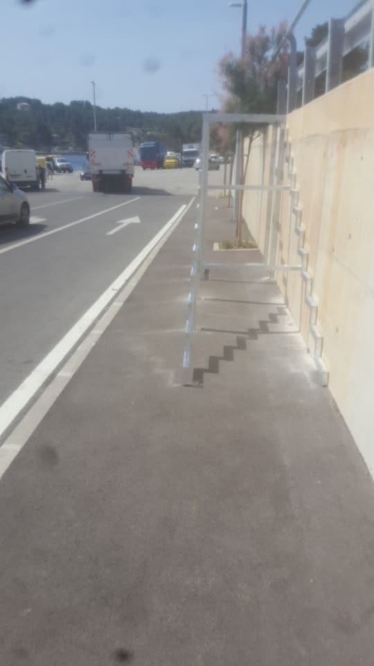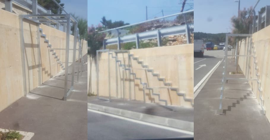 Nepoznata osoba odlučila je zauzeti dio pločnika i montažnim stubama povezati dvije ceste, vjerojatno kako bi skratila put do mora. Za dovršetak ovog bizarnog pothvata nedostajalo je još samo rezanje zaštitne ograde kako bi skale dobile funkciju, što je protivno svim prometnim pravilima.