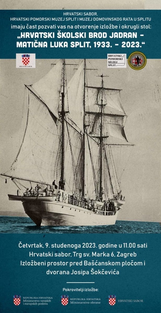 Izložba i okrugli stol "Hrvatski školski brod Jadran – Matična luka Split 1933- 2023." ovoga četvrtka, 9. studenog održat će se u saboru. Izložba će biti u prostoru ispred Bašćanske ploče, a okrugli stol u dvorani Josipa Šokčevića.