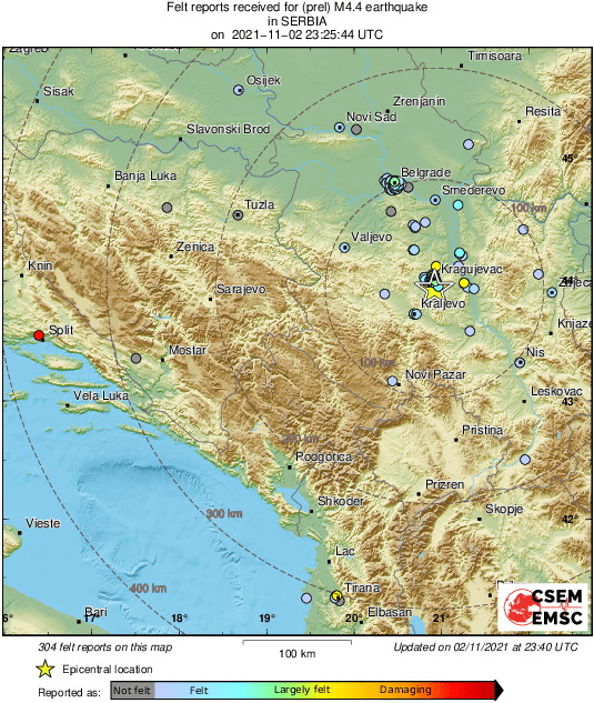 Prema prvi informacijama EMSC-a, magnituda potresa je iznosila 4.4 prema Richteru, a epicentar je bio 10 kilometara jug-jugoistočno od Kragujevca.