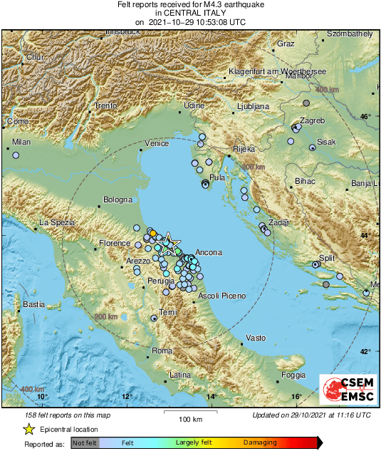 Prema prvim podacima EMSC-a, potres jačine 4,9 prema Richteru pogodio je Italiju oko 12:50 sati.