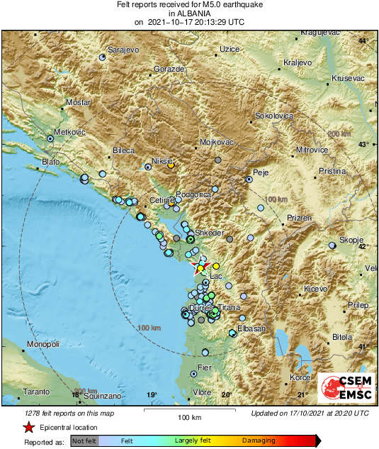M4.8 #earthquake (#tërmet) strikes 55 km NW of #Tirana (#Albania) 14 min ago. Updated map of its effects: pic.twitter.com/LjAW4J6INa