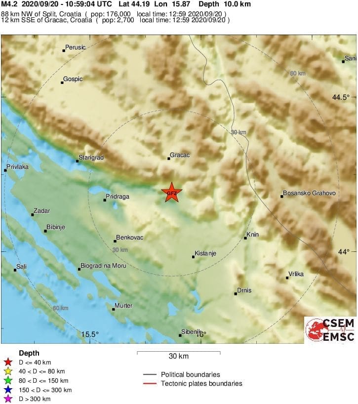 EMSC javlja da je magnituda potresa 4.2 po Richteru, a epicentar 12 kilometara jug-jugoistočno od Gračaca, 88 kilometara sjeverozapadno od Splita.