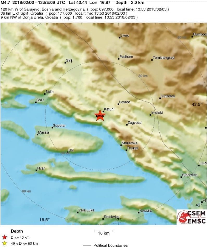 Prve informacije kažu kako je epicentar potresa bio između Zadvarja i Šestanovca magnitude 4.7 po Richteru i na dubini od 2 kilometra.