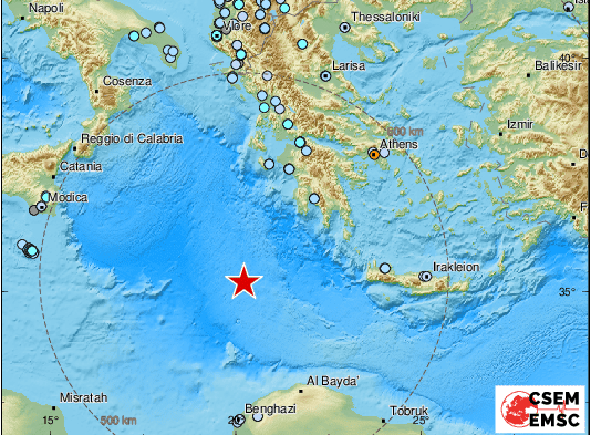 Jutros oko 1.40 sati u središnjem dijelu Sredozemnog mora zabilježen je jak potres magnitude 5.8 stupnjeva, 439 kilometara jugozapadno od Atene.