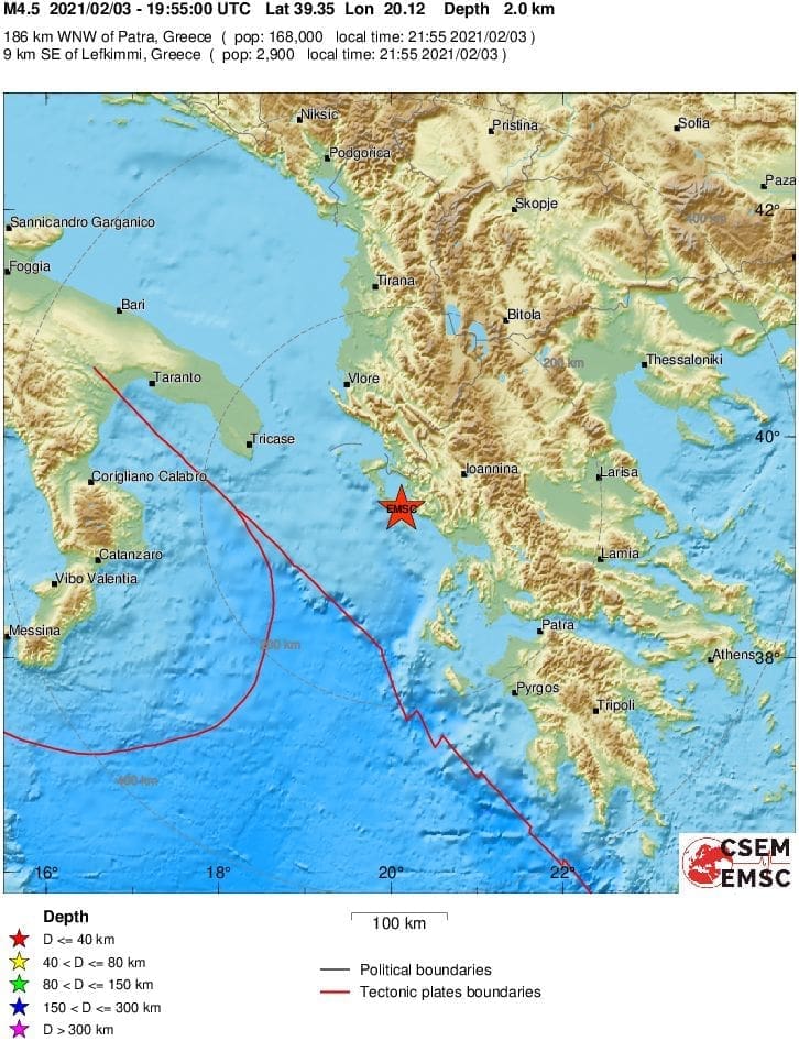 Prema podacima EMSC-a, magnituda je iznosila 4.5 prema Richteru, a epicentar je bio 10 kilometara jugoistočno od grada Lefkimmi.