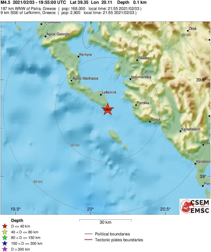 Prema podacima EMSC-a, magnituda je iznosila 4.5 prema Richteru, a epicentar je bio 10 kilometara jugoistočno od grada Lefkimmi.