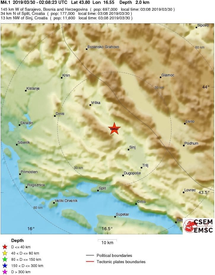 EMSC je izvijestio da je magnituda potresa u epicentru bila 4,1 po Richteru. Prve procjene govore da je epicentar potresa bio 13 km sjeverozapadno od Sinja i 31 km sjeverno od Splita.