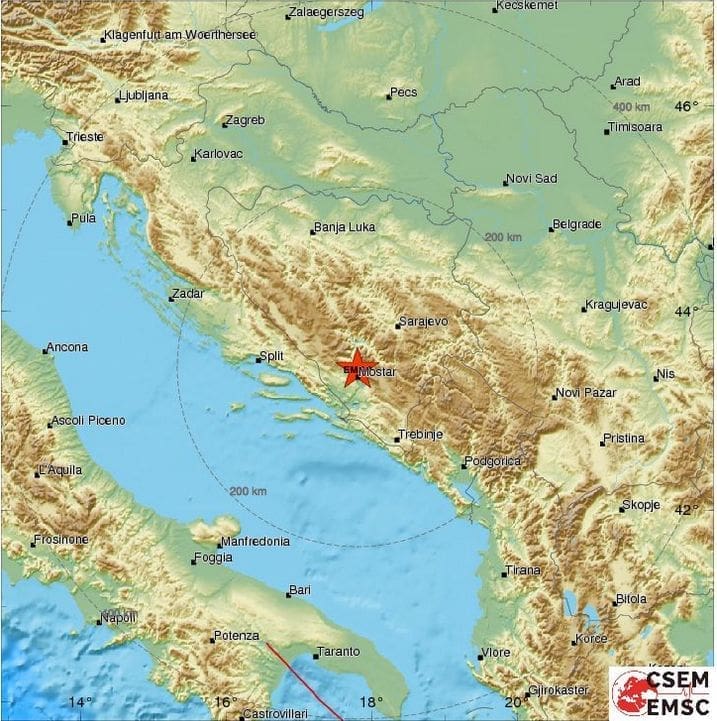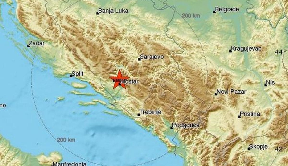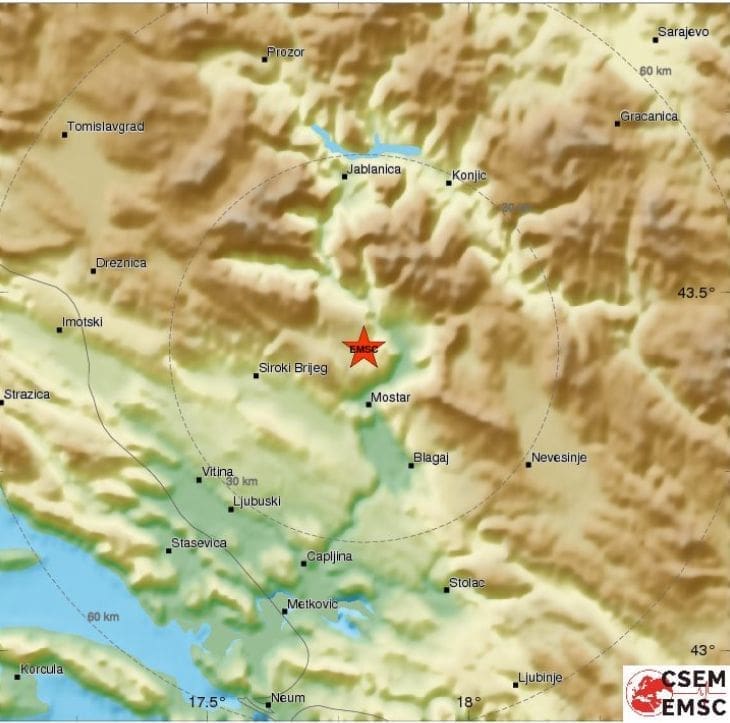 EMSC (Europski Mediteranski Seizmološki Centar) izvijestio je da je umjereno jak potres 47 minuta nakon ponoći pogodio južne dijelove susjedne BiH.