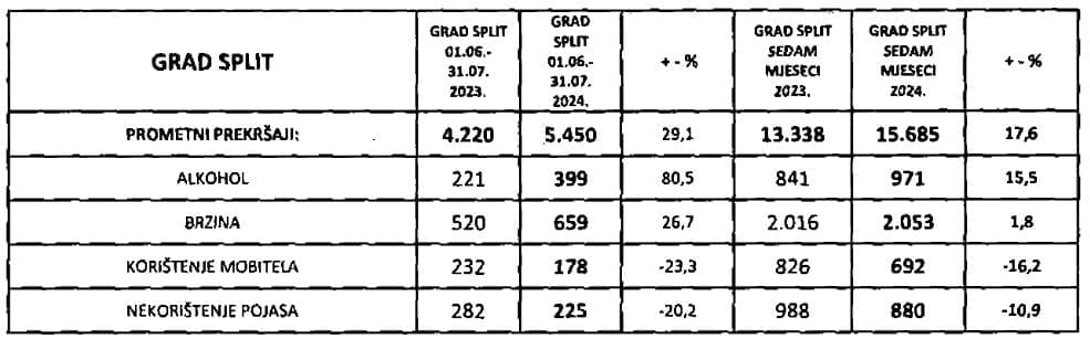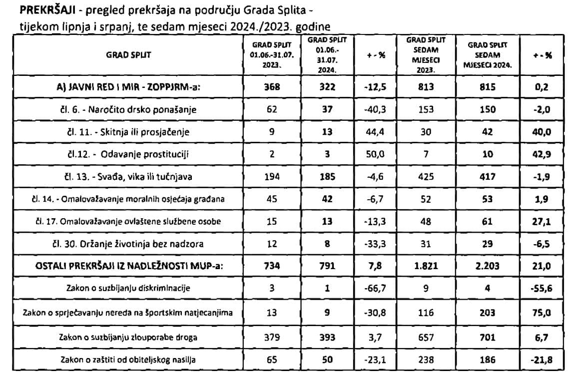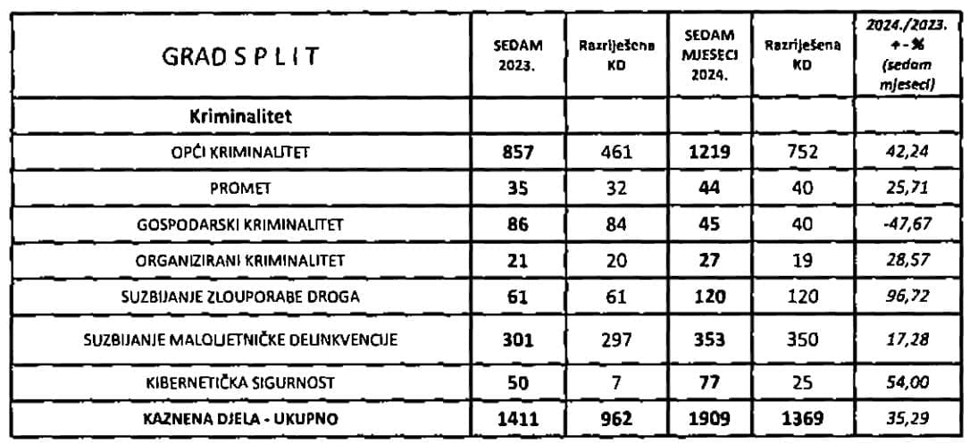 Na području Splita Policijska uprava je zabilježila porast ukupnog broja kaznenih djela u prvih sedam mjeseci ove godine u odnosu na isto razdoblje prošle 2023. godine za čak 35,29%. Postotak je to koji para uši. Šokantan je i rast postotka na području suzbijanja zloporabe droga od 96,72 posto. Policija to tumači svojom efikasnošću i i prioritetom u radu policije.