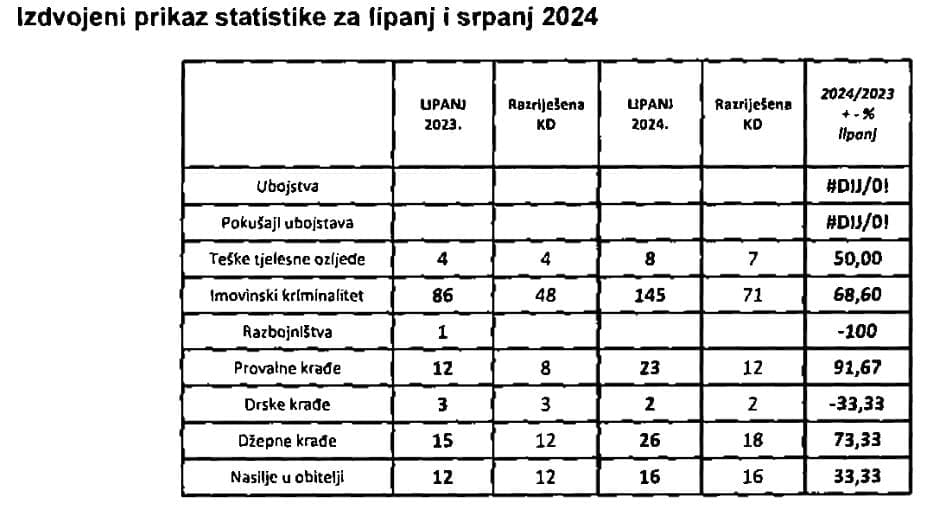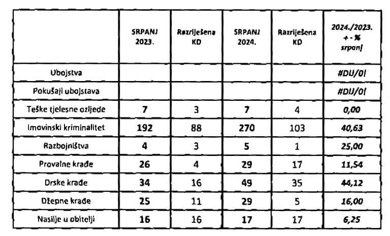 Od imovinskog kriminaliteta najveći broj su krađe i provale. Razbojništva kao najteži oblik imovinskog kaznenog djela je sve manje. U prvih sedam mjeseci ove godine evidentirano je 20 tih kaznenih djela, od čega je policija u 11 slučajeva otkrila počinitelje.
