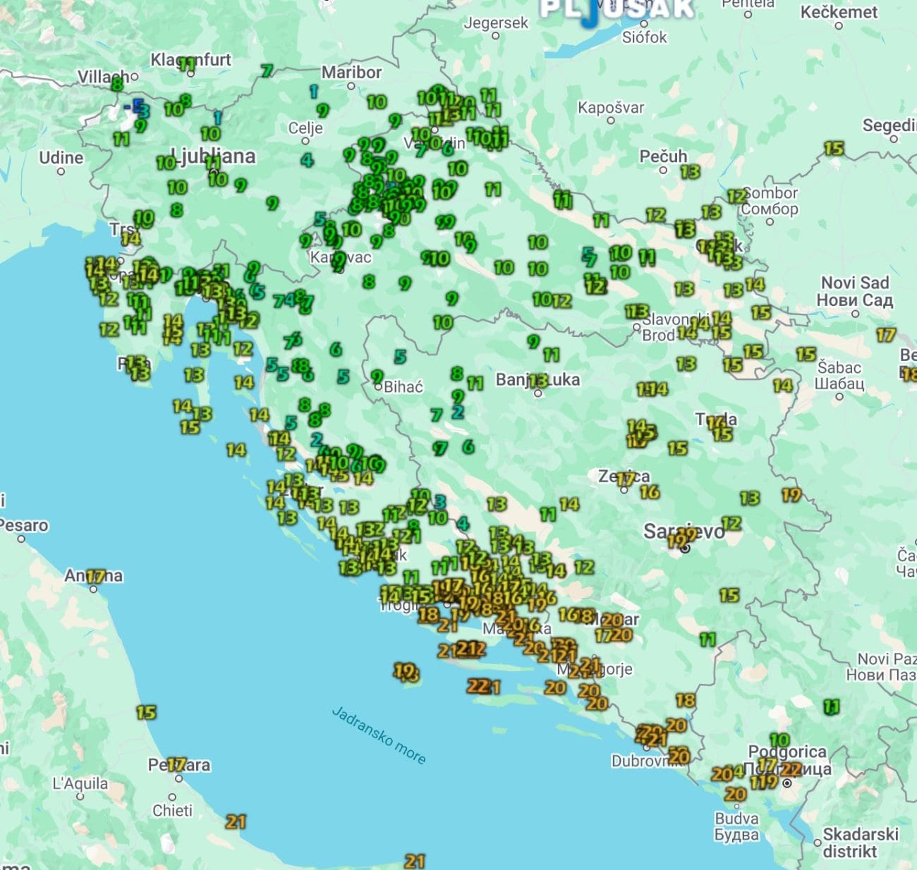 U vrijeme pisanja članka (9 sati) fronta se nalazila iznad srednje Dalmacije. Temperatura zraka u Kninu pala je na samo 10°C, na Sinjalu na Dinari na 2°C. O velikim temperaturnim razlikama na malom području svjedoči i sljedeći podatak. U Šibeniku je 13°C, a na splitskom području do 20°C uz jugo.