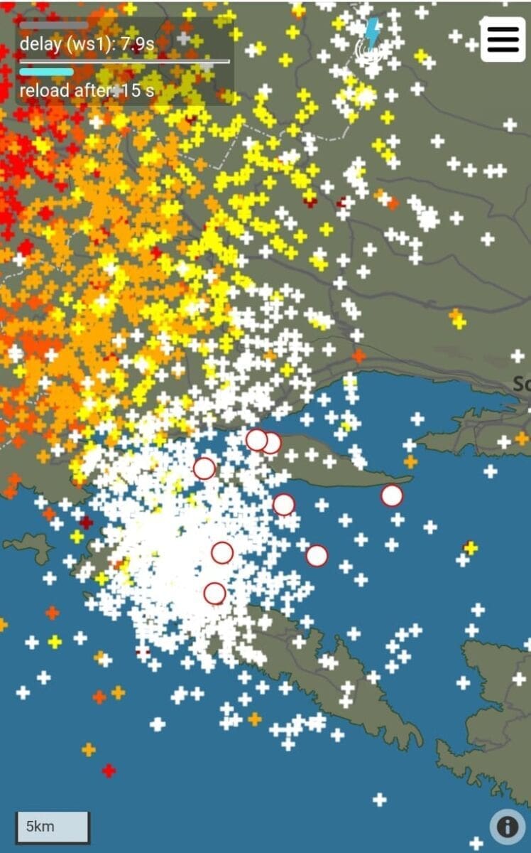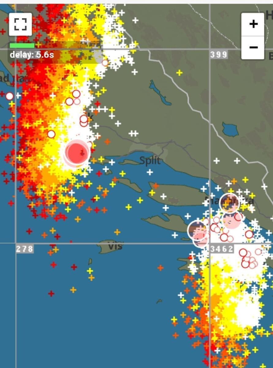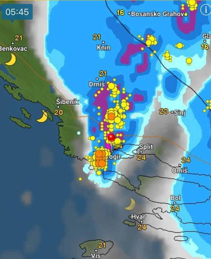 Naši čitatelji javljaju da je izrazito jako nevrijeme zabilježeno prije zore na otoku Čiovu i širem trogirskom području. Tamo se razvio olujni oblak koji je donio kišu, pljuskove, grmljavinu, ali i tuču. Zbog velike količine oborina u kratko vrijeme dijelovi Čiova su se našli pod vodom, a ponegdje je palo i nekoliko centimetara tuče. Još nije poznato je li izazvala materijalnu štetu, ali pojedina zrna tuče bila su veličine oraha.