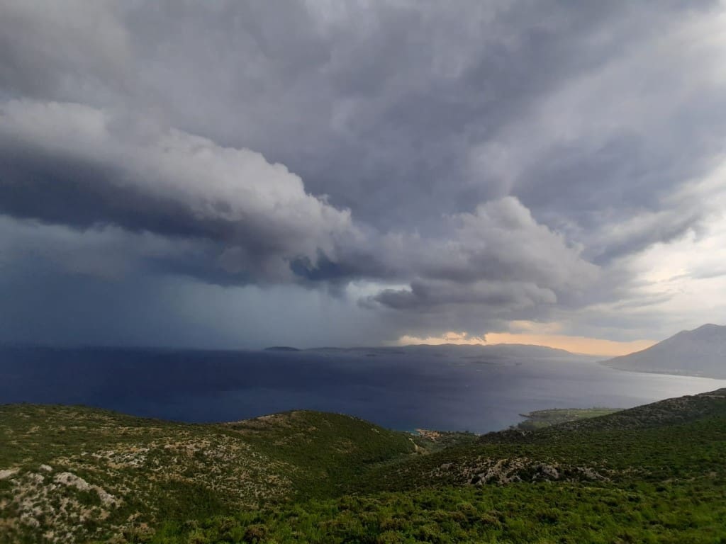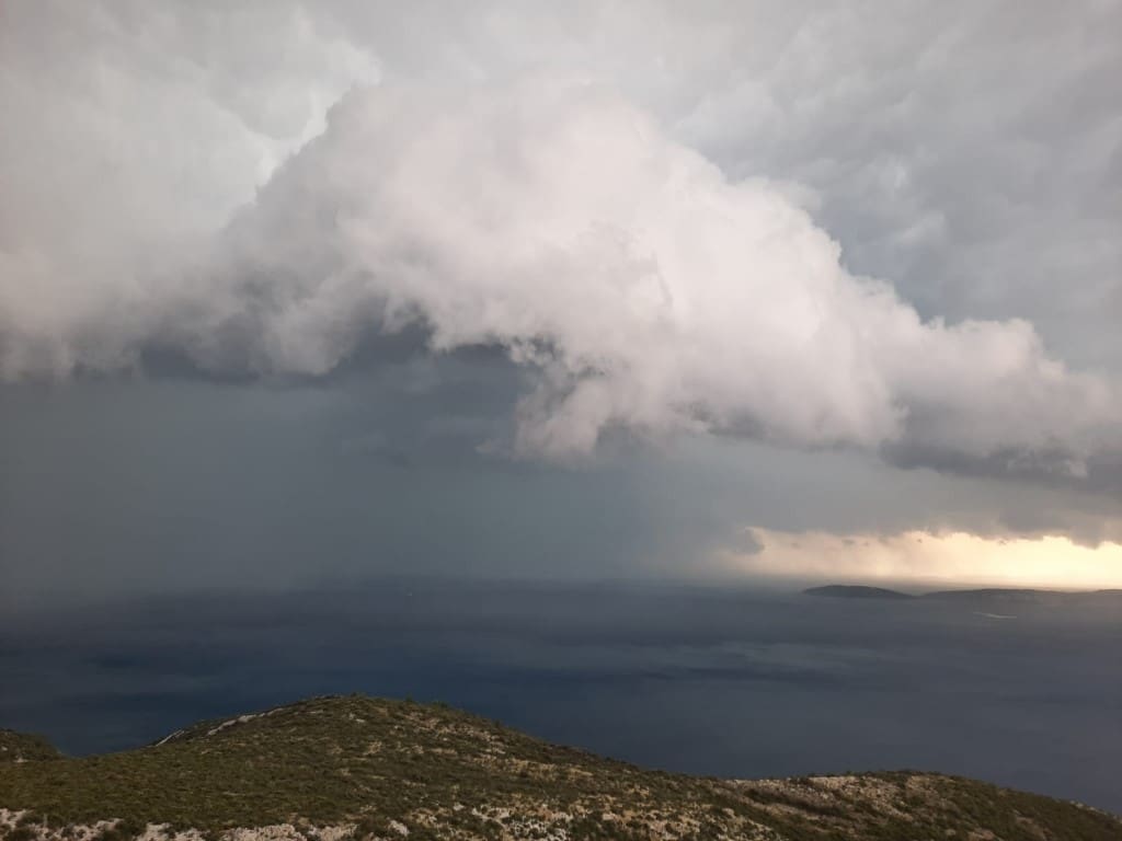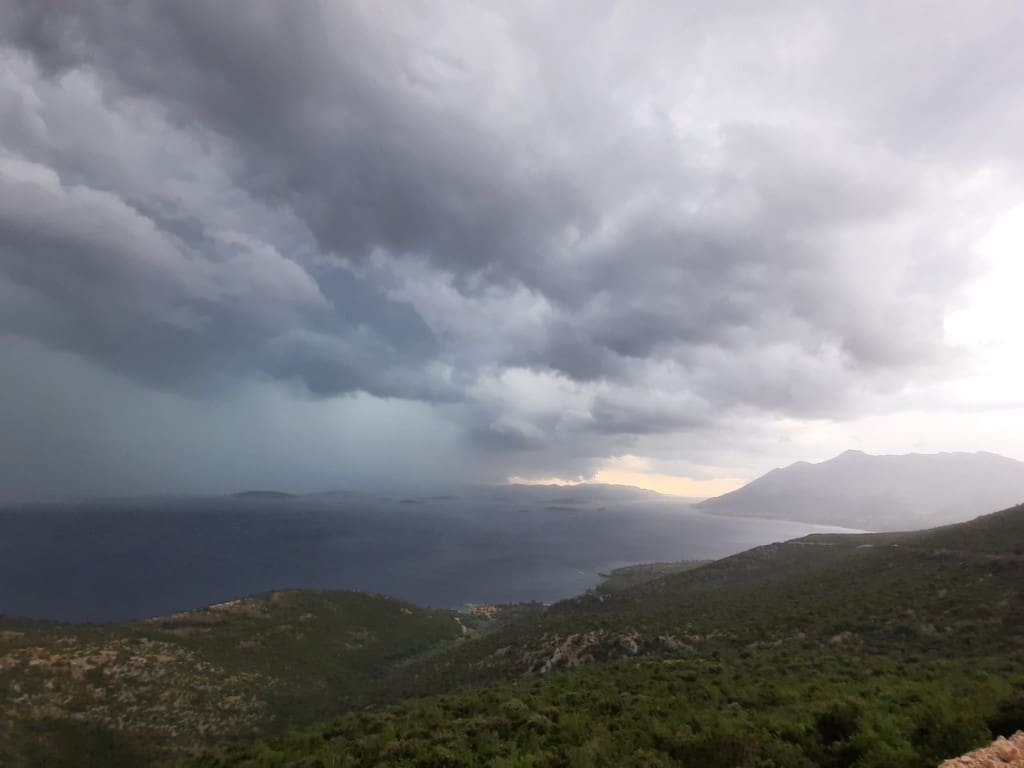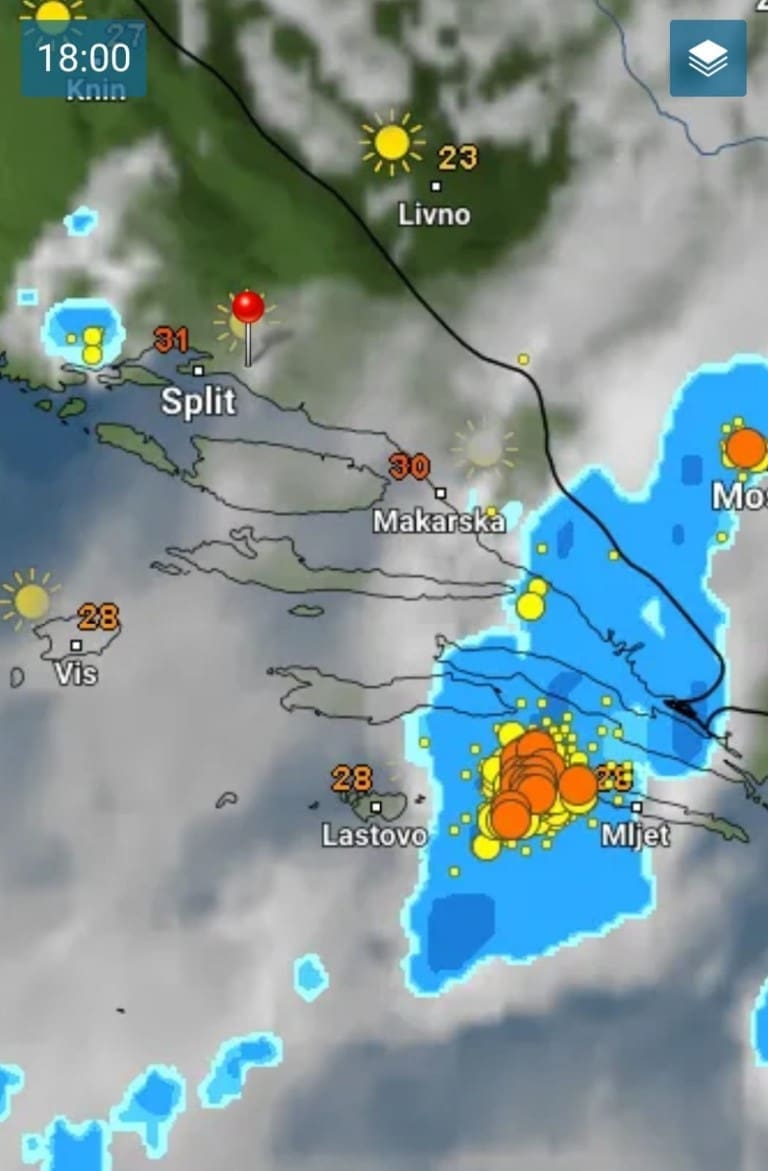 Sustav jakih grmljavinskih oblaka stvorio se iza 17 sati na području između Mljeta, Korčule i Pelješca, tamo je bilo lokalno kiše, grmljavine, čak i tuče.