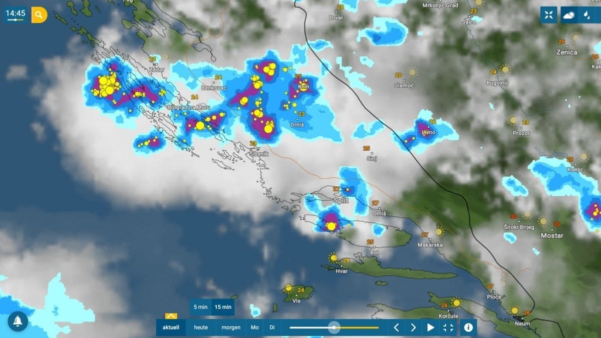 U 16 sati dva najjača grmljavinska oblaka u Dalmaciji nalaze se zapadnije od Benkovca i u zaleđu Trogira. Tamo i dalje ima izraženih grmljavinskih pljuskova, ponegdje i tuče.