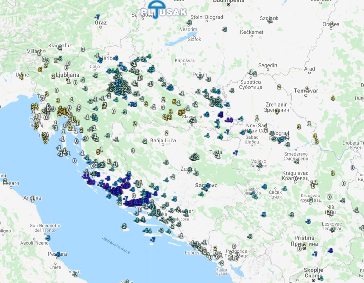 Prema podacima mreže postaja Pljusak.com, najviše kiše do 16 sati palo je u Benkovcu, 36 litara po kvadratnom metru. Slijede Trilj 33, Prvić Luka 27, Kistanje i Silba 24, Sinj, Dinara Velika Duvjakuša, Pag i Drage 21, Šibenik 20, Oklaj 19 itd.