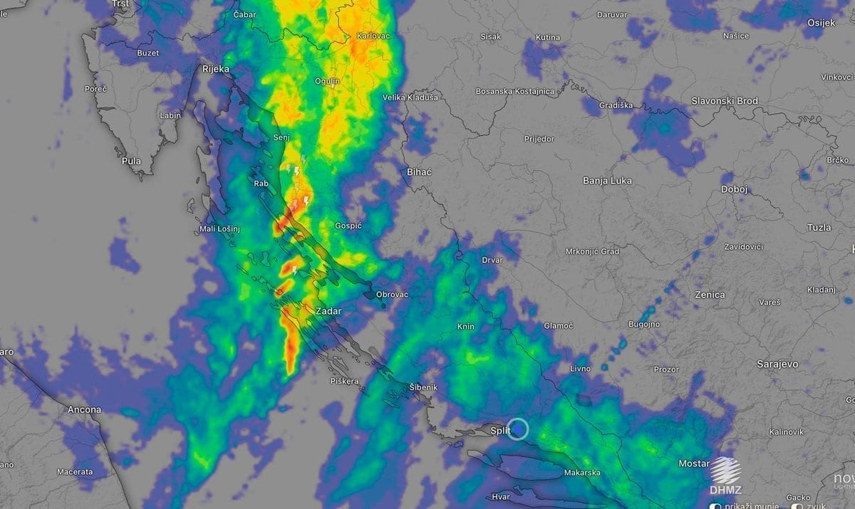 U večernjim satima hladna fronta zahvatila je sjeverni i dio srednjeg Jadrana. Izraženi grmljavinski pljuskovi premjestili su se sa područja Italije nad Istru, a potom i podvelebitski kanal i krajnji sjever Dalmacije.