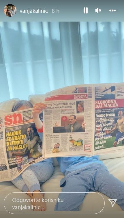 Njegov pogodak na Instagramu je proslavila i supruga Vanja Kalinić. Osim fotografija s utakmice, objavila je i preslatku fotografiju na kojoj njihova djeca, sin Matej i kćerkica Lote, čitaju novine na čijim je naslovnicama njihov tata.