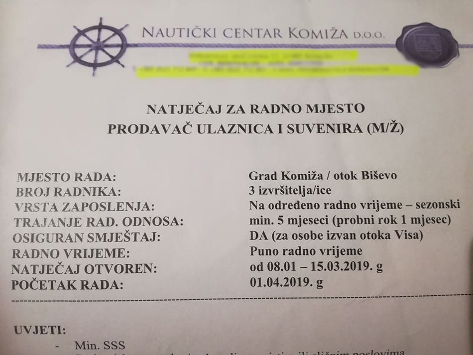 – Za radno mjesto “Prodavač/ica suvenira i ulaznica za Modru špilju na Biševu”, osnovna plaća je 5.500 kn do 7.900. Smještaj je osiguran, ali hrana nije. Radno vrijeme je 8 sati dnevno. Za radno mjesto “Privezivač plovila / Redar u luci” Fiksna je plaća 6.600 kn. Nema smještaja ni hrane – dodaje.