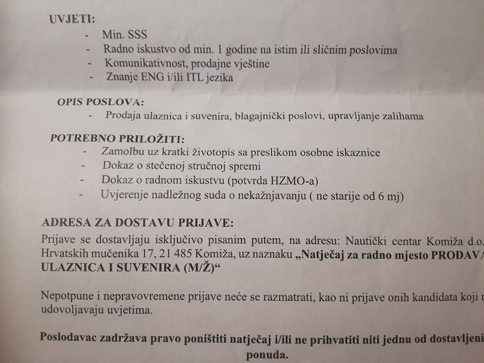 Razočarana sam jer oglas nije realan i još jednom dovodi u pitanje poštenog i iskrenog poslovanja. Moguće je da će i pronaći radnu snagu ali poznavajući uvjete rada na otoku, skupoću i stres vrlo vjerovatno je da će u pola sezone ostati bez osoblja i time naštetiti vlastitom poslovanju – uvjerena je čitateljica koja je svoju potrebu za sezonskim poslom odlučila potražiti ipak negdje drugdje.