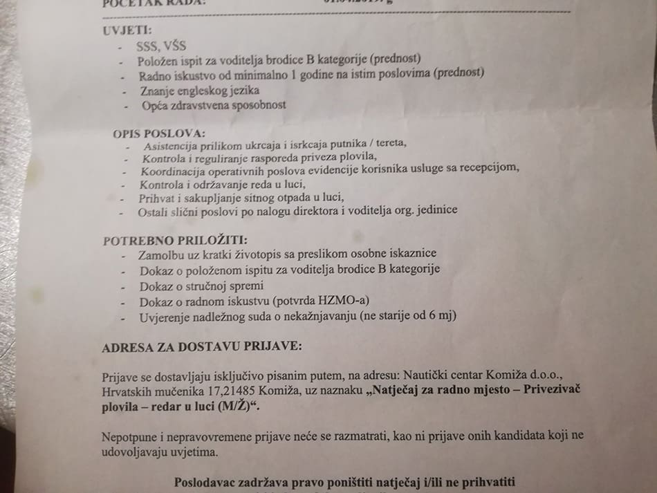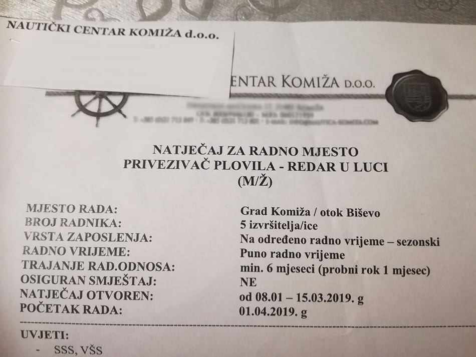 Neobični oglasi za pristojne plaće. Tako je Nautički centar Komiža prošli mjesec traži radnike putem oglasa na društvenim mrežama. Prema tekstu u oglasima, nude se plaće koje nisu loše, smještaj, ali i mogućnost nagrade za dobar rad, kao i zimske plaće, iako se radi sezonski – do 7 mjeseci. No, je li baš tako? Čitateljica je tragom ove informacije otišla provjeriti i došla do zanimljivih spoznaja.
