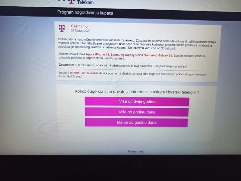 Na redakcijski e-mail javio nam se Splićanin koji je u vikendu za nama primio lažnu ponudu od tvrtke koja se predstavljala kao T-com.