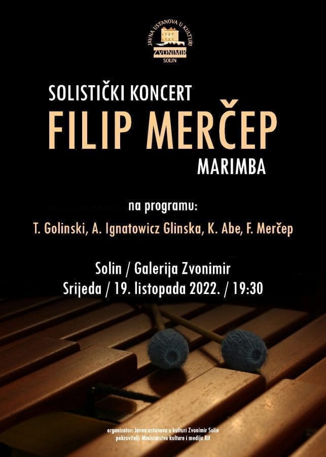 Javna ustanova u kulturi Zvonimir Solin u sklopu koncertne sezone 2022/23 priređuje solistički koncert Filipa Merčepa, poznatog hrvatskog udaraljkaša mlađe generacije, koji će nastupiti na marimbi.