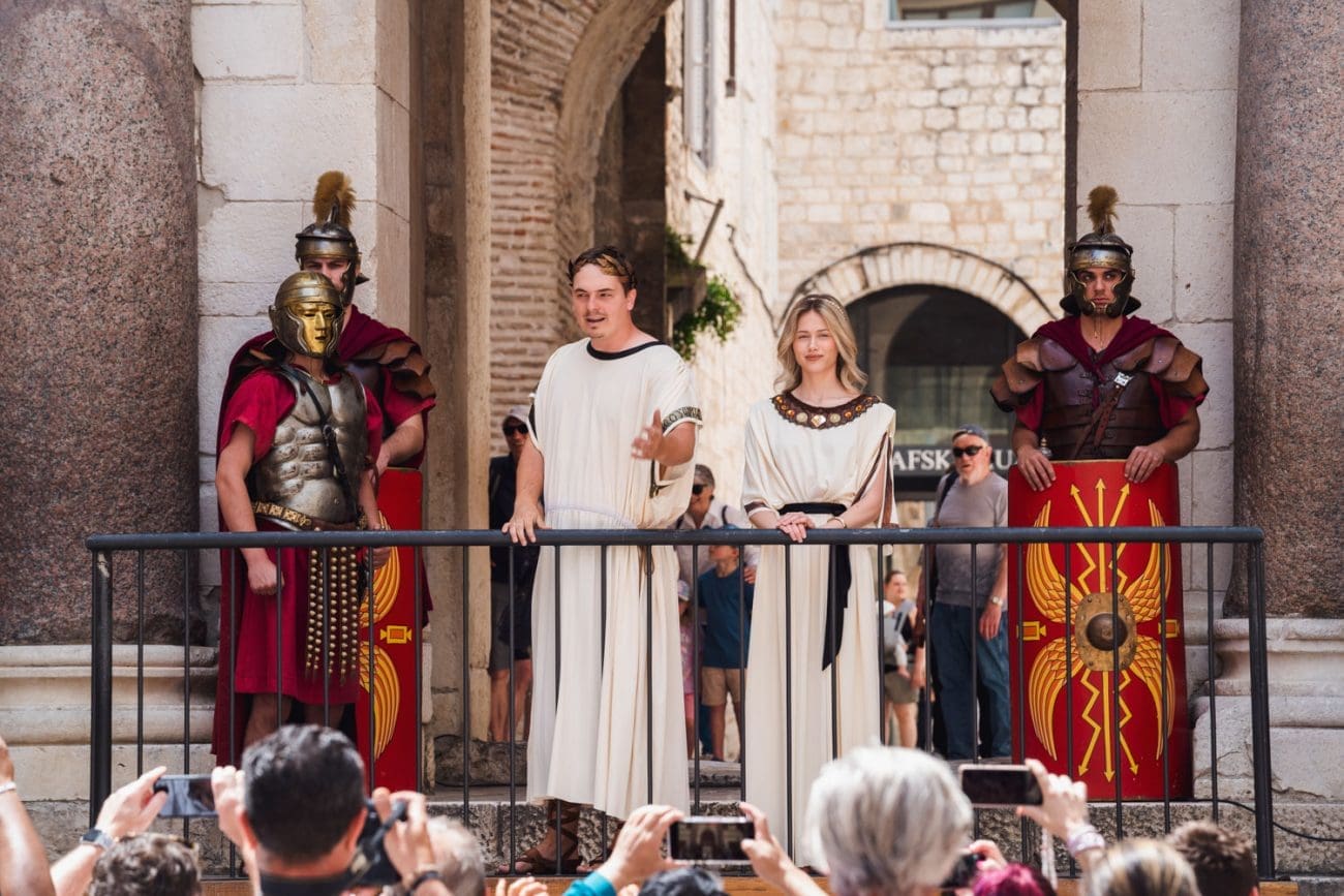 Vizualna interpretacija Dioklecijana u Splitu, kakvu viđamo tijekom turističkih programa, pripada posve drugoj logici. Riječ je o scenskoj, prezentacijskoj estetici koja kombinira različite rimske stereotipe – od republike do carstva – s ciljem stvaranja prepoznatljive i atraktivne slike za posjetitelje.