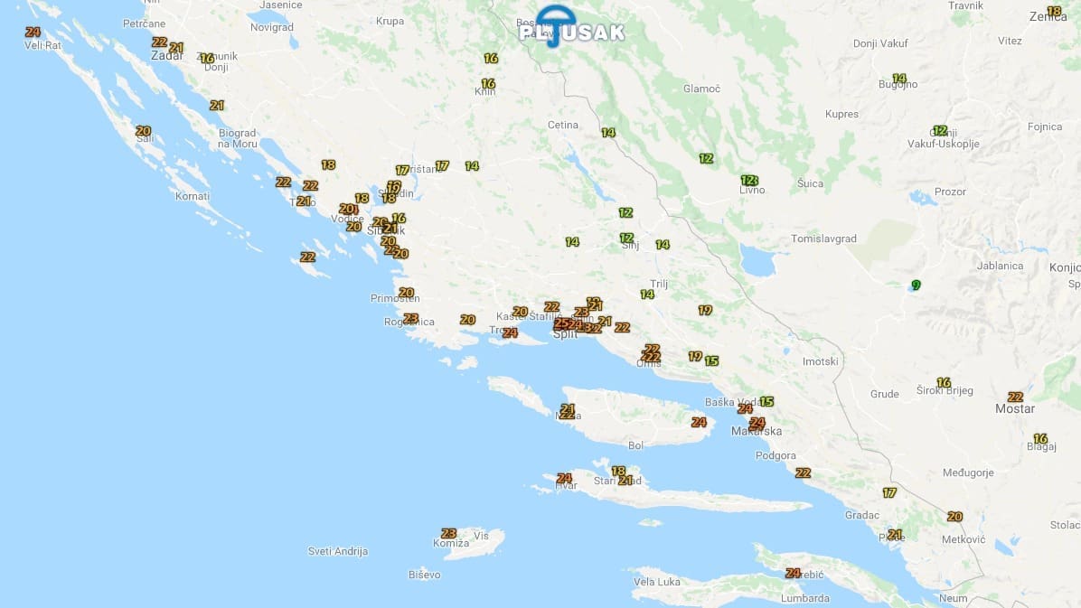 Prilična jutarnja svježina moga se danas ujutro osjetiti u velikom dijelu Dalmatinske zagore. U Cetinskoj krajini minimalne temperature zraka pale su na samo 12 stupnjeva u ranim jutarnjim satima. Obala i otoci bili su znatno topliji s minimalnim temperaturama od 20 do 24°C. Rano poslijepodne temperature su od 30 do 33°C.