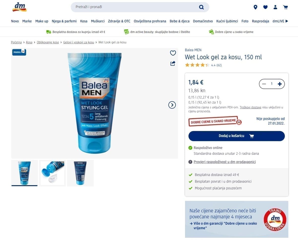 Ona je naime usporedio DM proizvode u Njemačkoj i Hrvatskoj i to sa službenih stranica ove tvrtke u ove dvije zemlje. Podaci su poražavajući, ali za hrvatske kupce. Primjerice, gel za kosu "Wet look" od 150 ml u Hrvatskoj košta 1,84€, a isto artikl u Njemačkoj košta 0,85€.