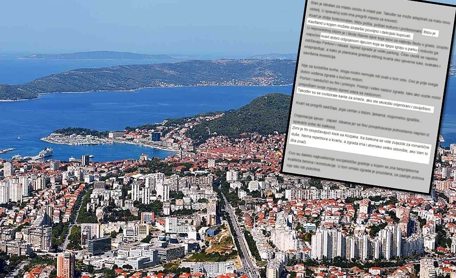 Od jučer se društvenim mrežama širi atraktivan oglas s Njuškala kojim netko vrlo kreativan pokušava prodati stan u Splitu. U želji da da pronađe kupca koji će u ovim nezgodnim vremenima dati 127 tisuća eura za njegovu nekretninu, čovjek se stvarno potrudio da istakne sve prednosti stana koji prodaje. Uz uobičajen popis sadržaja u okolici koji će biti na raspolaganju novom vlasniku, poput blizine škole, ljekarne i joga centra, sjetio se još nekih lokacijskih kvaliteta koje je odlučio istaknuti, piše Telegram.