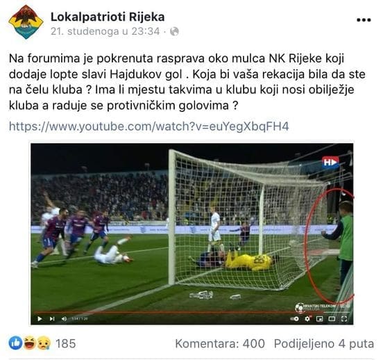 Sramotna objava našla se 21.11.2021. na riječkoj Facebook stranici Lokalpatrioti Rijeka. Stranica preispituje ponašanje dječaka za vrijeme gola.