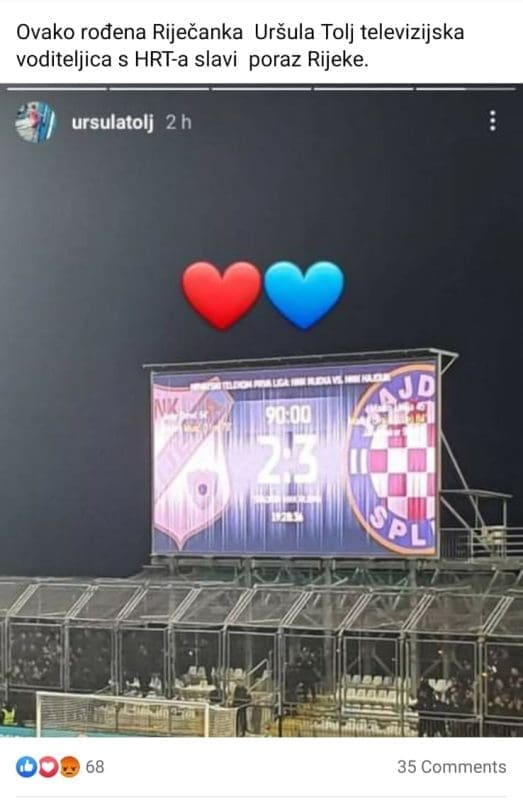 "Ovako rođena Riječanka Uršula Tolj, televizijska voditeljica s HRT-a, slavi poraz Rijeke", napisali su uz objavu Uršulinog InstaStoryja na kojem je stavila hajdučka srca na fotografiju semafora na kojem je konačan rezultat nedjeljne utakmice.
