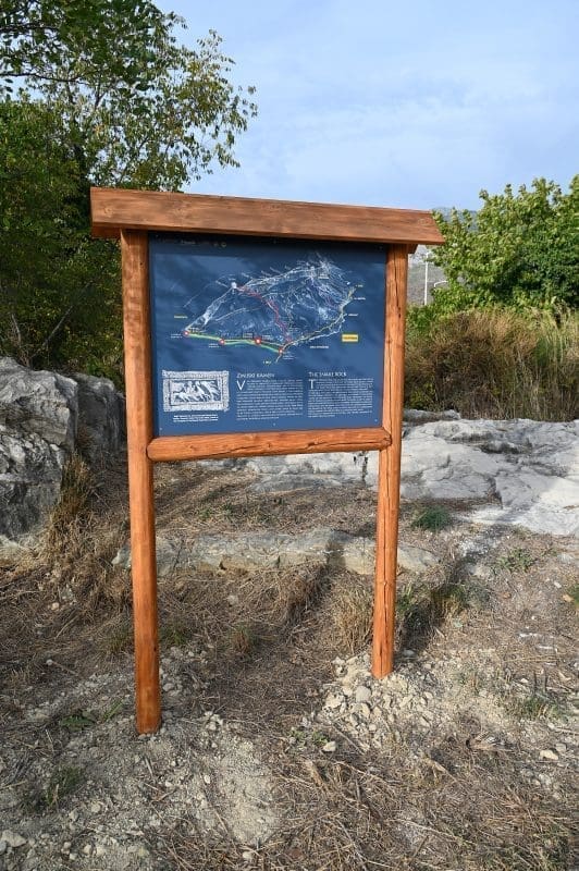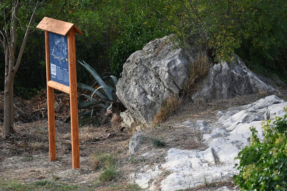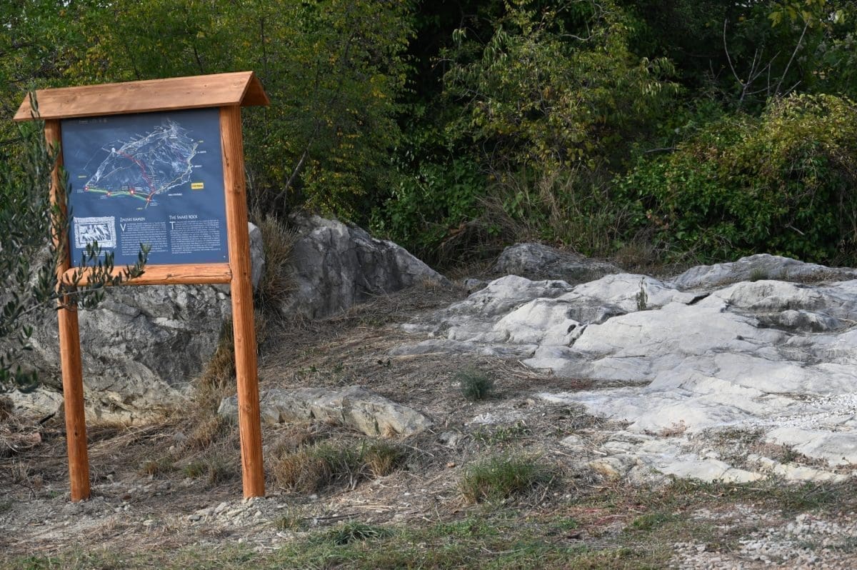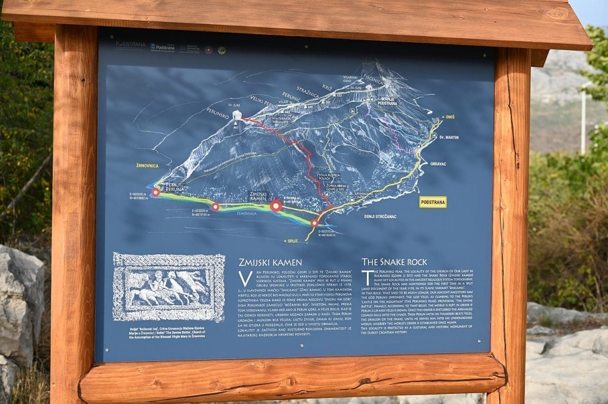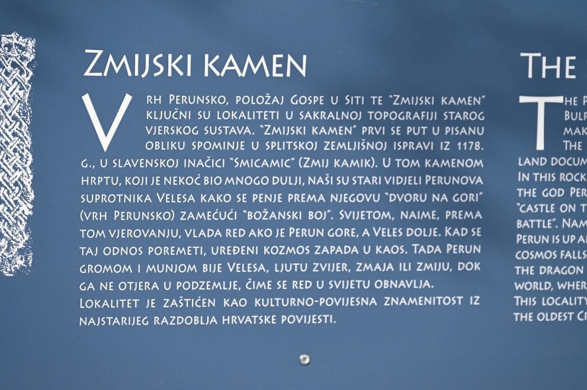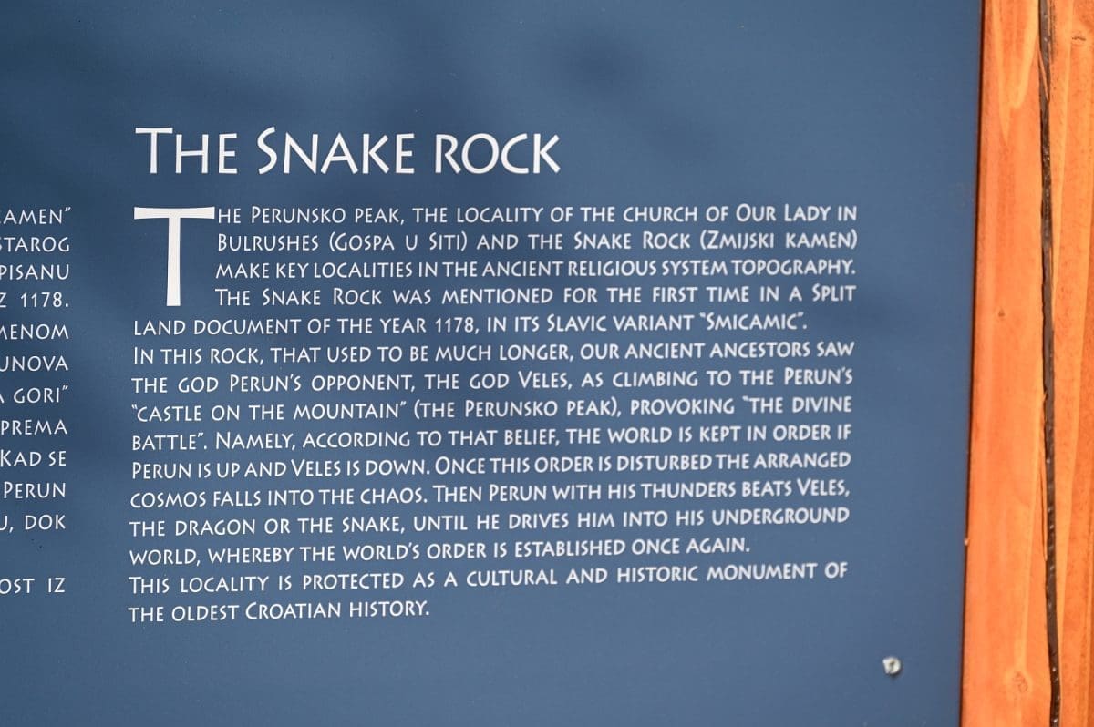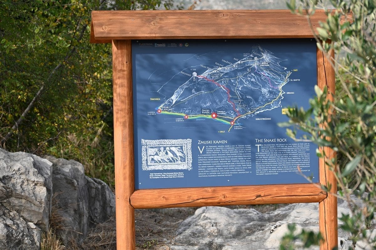Pa, evo o čemu se tu radi. Površina koja je uređena uz taj kamen-živac jedna je od četiri kontrolne točke nove podstranske tematske staze „Put prema izvoru“. Točka se zove Zmijski kamen, upravo po onome kamenu-živcu kod kojega je uređena, a koji se, zajedno s okolnim zemljištem, pod tim istim imenom, ali u ondašnjem obličju – Smicamic spominje u splitskoj ispravi iz 1178. godine koja opisuje razvod baštine na Perunu. Danas je taj Zmijski kamen uvršten u Registar kulturnih dobara Republike Hrvatske kao kulturno-povijesno mjesto i upisan je pod registarskim brojem Z-6817.