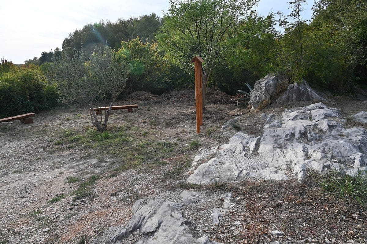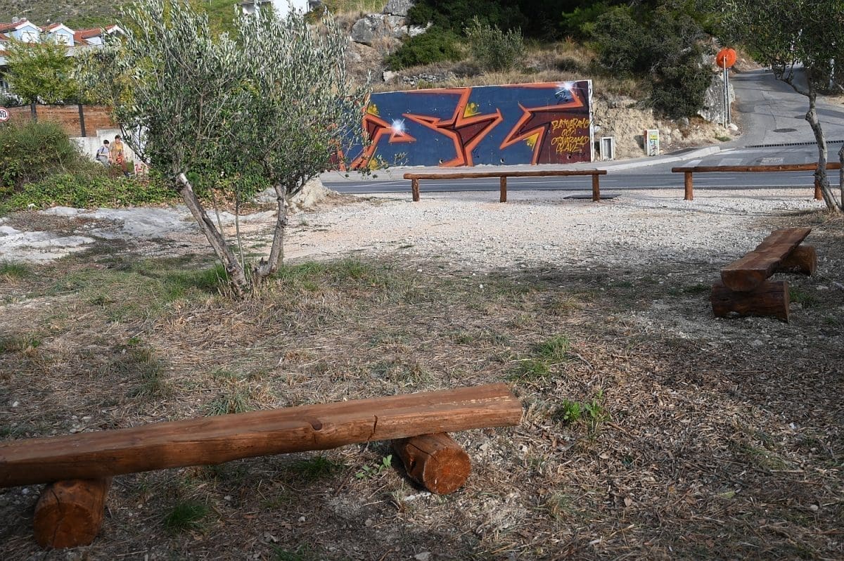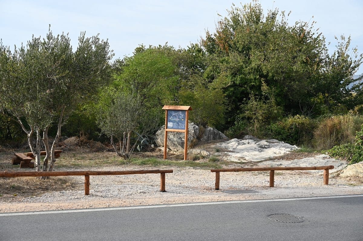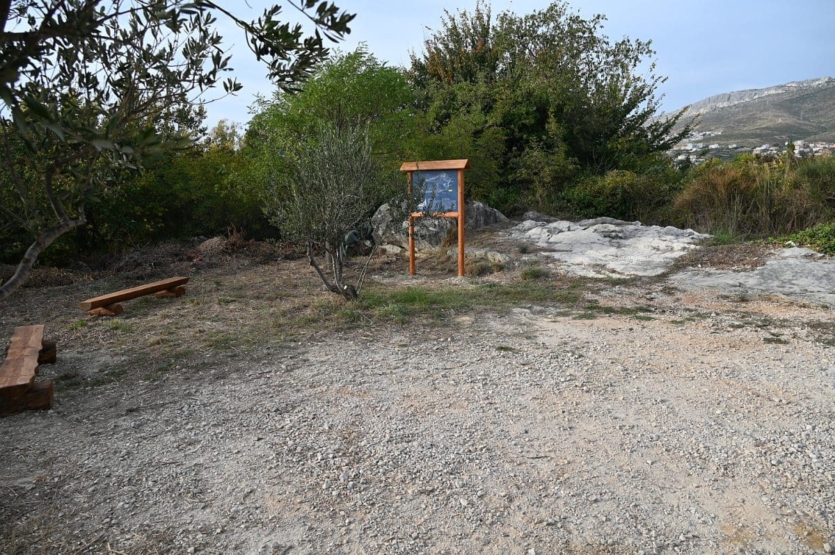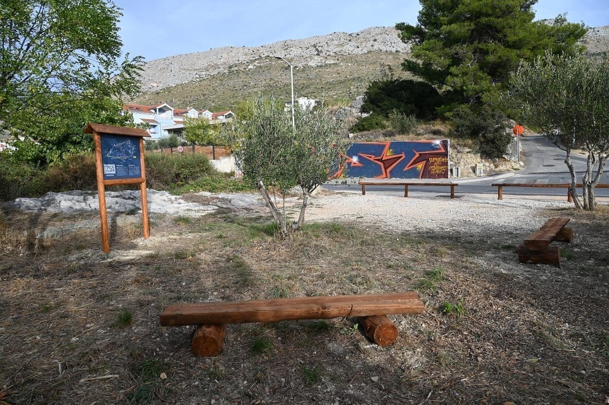 Ima već nekoliko dana da je neposredno uz kolnik Poljičke ceste, kojom se s magistrale skreće u Žrnovnicu, na petstotinjak metara od toga skretanja, s lijeve strane, a prekoputa Tommya, uređen dio zemljišta. Površina od otprilike 100 metara četvornih, na kojoj su još 2010. posađene dvije masline i jedan bagrem, ograđena je nedavno niskom ogradom od drvenih oblica, opremljena je dvjema drvenim klupama i info-pločom postavljenom u drveni okvir na oko metar visine. Ta je ploča postavljena uz onizak kamen-živac na sjevernoj strani toga malog ograđenog prostora, a klupe na njegovu suprotnu stranu tako da oni koji na njima sjede gledaju u ploču i kamen, rijeka im, koju odatle ne vide od raslinja, teče slijeva, a Perun im je zdesna. To se tako vidi s ceste i onaj koji ne uđe u taj ograđeni prostor ne može samo na temelju toga što vidi u prolazu, s ceste, razabrati o čemu je riječ.