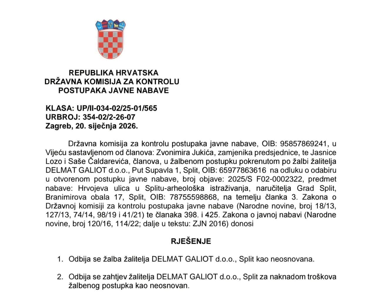 Nakon razmatranja žalbe, DKOM je poništio prvotnu odluku o odabiru izvođača te naložio novi postupak. Prema toj odluci, posao je dodijeljen tvrtki Neir, iako je pritom utvrđeno da ni Delmat Galiot, koji je uložio žalbu, nije ispunjavao uvjete natječaja. Time je, kako ističe Ivošević, izgubljeno dragocjeno vrijeme, a projekt će se realizirati po višoj cijeni.