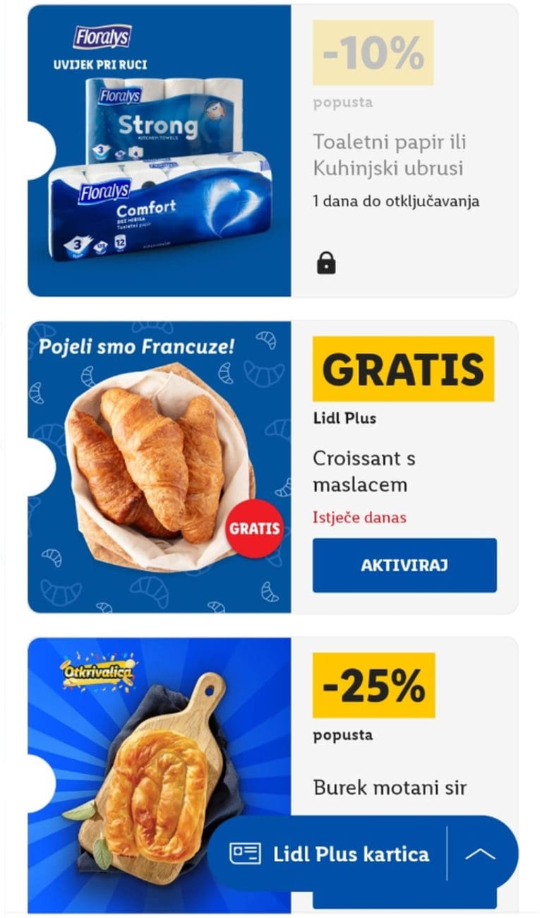 Trgovački lanac Lidl danas je odlučio počastiti svoje kupce besplatnim croissantom s maslacem – i to potpuno besplatno! Kako javljaju čitatelji Dalmacije Danas, u aplikaciji Lidla osvanula je obavijest da svi korisnici Lidl Plus kartice mogu preuzeti svoj gratis croissant.