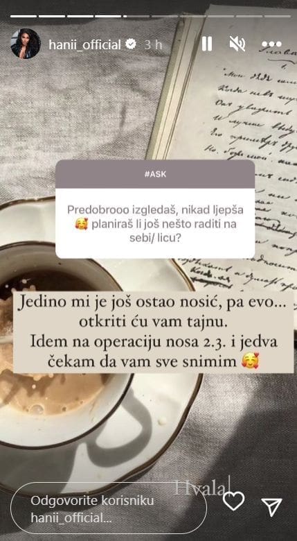 Na konstataciju i pitanje njezine pratiteljice: 'Predobro izgledaš, nikad nisi bila ljepša. Planiraš li još nešto raditi na sebi/licu?', Hana je odgovorila: 'Jedino mi je još ostao nosić, pa evo… Otkrit ću vam tajnu. Idem na operaciju nosa 2. ožujka i jedva čekam da vam sve snimim.'