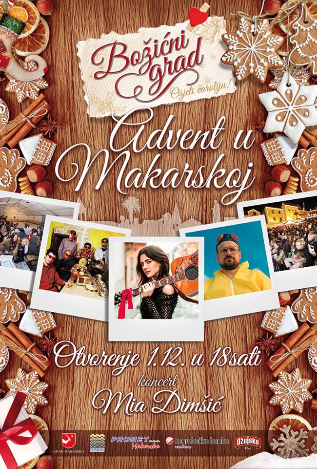 Adventska događanja koja će se odvijati na dvije pozornice u Makarskoj započinju koncertom popularne mlade pjevačice i kantautorice Mie Dimšić. U Božićnom gradu nastupit će i brojna druga imena hrvatske glazbene scene: Gustafi, grupa Viva, Vojko V., Gazde, Mokarski tamburaši, Zdenka Kovačiček i Greenhouse Blues Bend, Dreamers - Tribute to Bijelo dugme, a Makarane i njihove goste u Novu 2019. uvest će raspjevani Mladen Grdović.