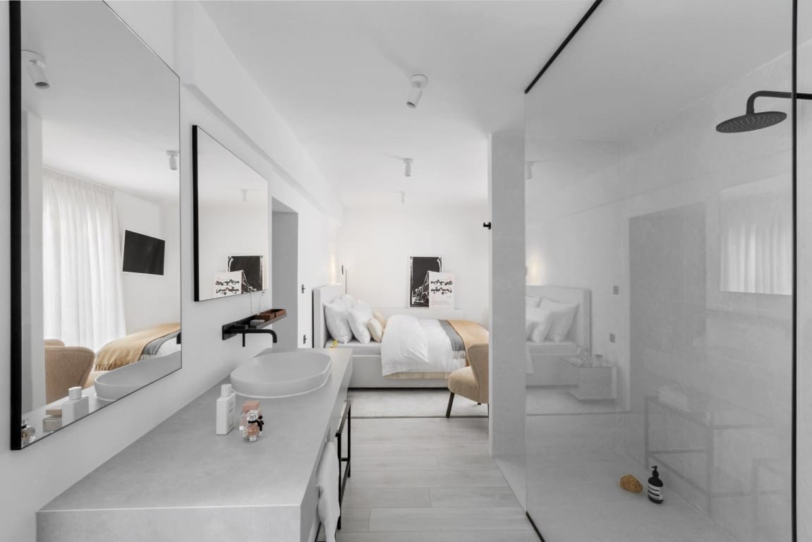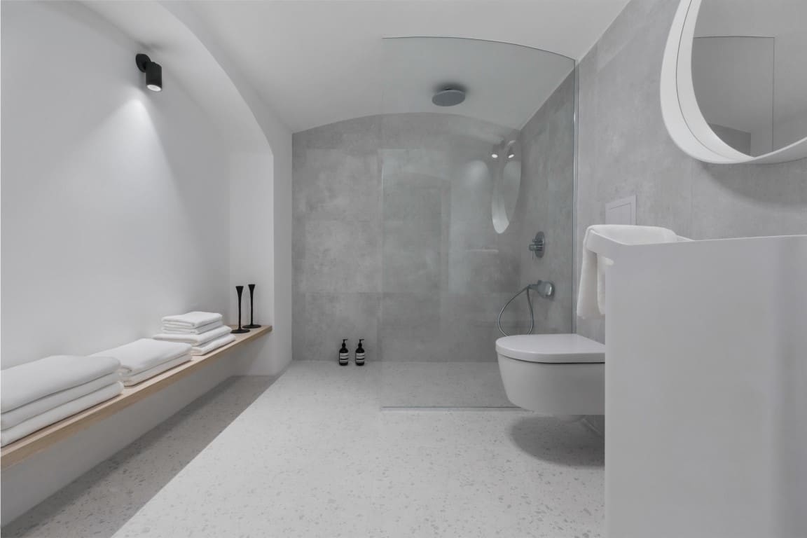 Umjetnički hodnik završava kupaonicom, koja izgledom podsjeća na wellness. Ulaskom u kupaonicu, pogled dakako krade walk-in tuš, dok se doživljaj wellness-a dodatno dobiva s lukovima i zaobljenim stropovima, a elegantnu bijelu boju nadopunila je zidna keramika sive boje.