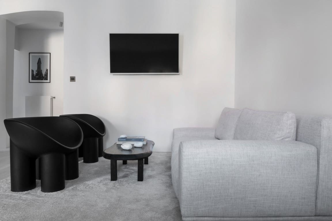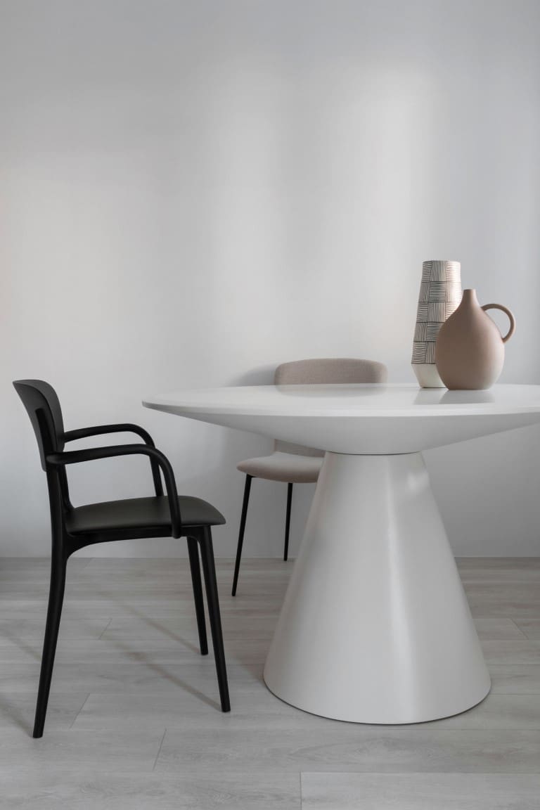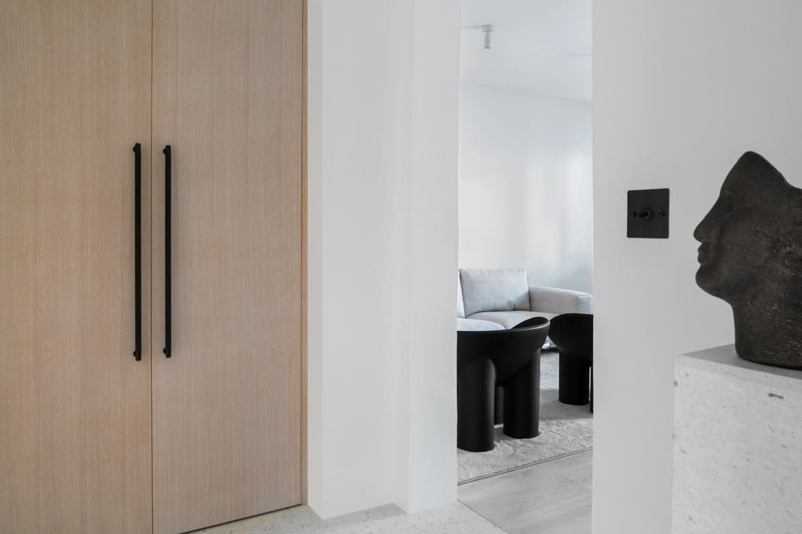 Jedan od zanimljivih detalja u crnoj boji su i ručno izrađene stolice brenda Faye Toogood, britanske dizajnerice poznate po dizajnima neobičnih oblika.