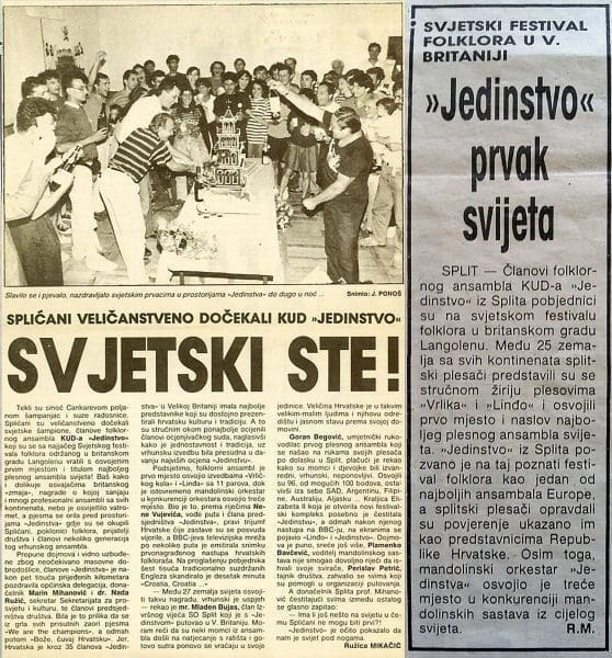 Citat je ovo iz članka Slobodne Dalmacije od 14.07.1992. godine kojim se prigodno popratio svečani doček svjetskih prvaka - pobjednika najjačeg Svjetskog festivala folklora - International Musical Eisteddfod / 46th Cultural Olympics održanog te iste godine u britanskom gradu Llangollenu (Wales).