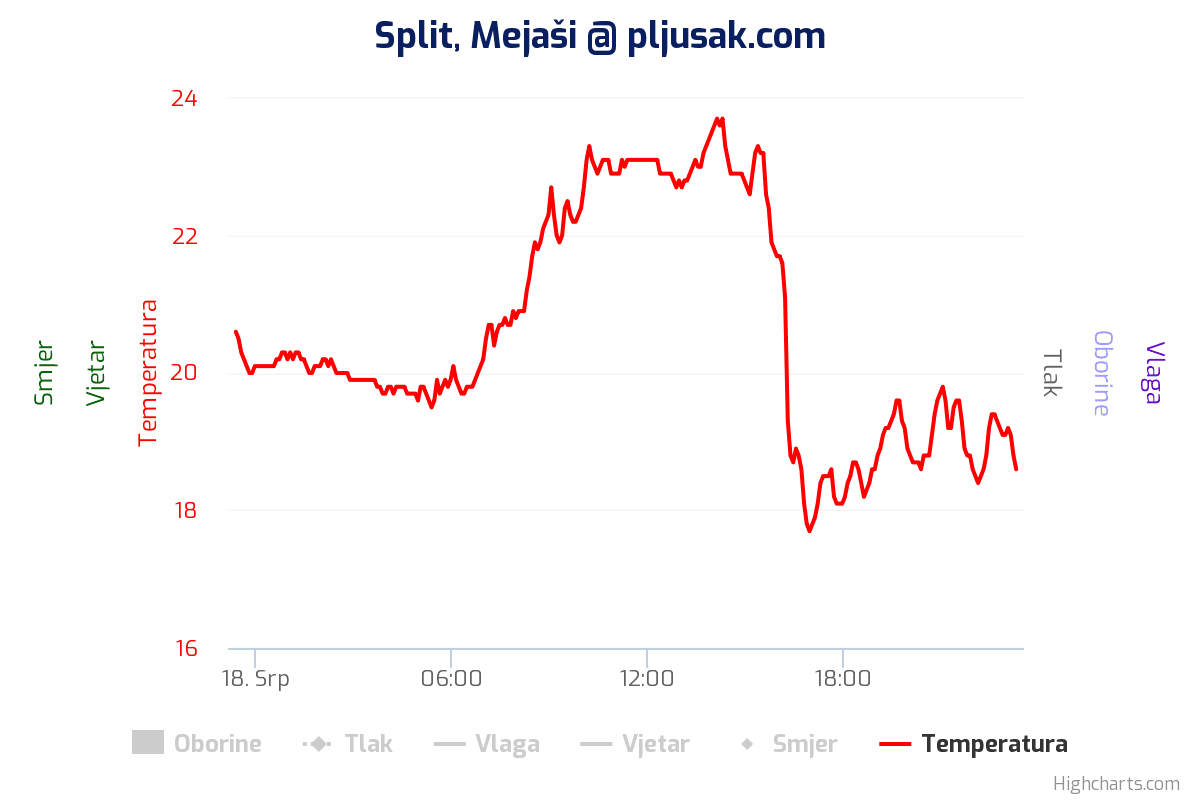 To se osobito moglo osjetiti u popodnevnim satima, kada je na svim mjernim postajama u srednjoj Dalmaciji došlo do izraženog pada temperature zraka. Primjerice, u Splitu je za nešto više od sat vremena temperatura pala s 23 na 17°C. U isto vrijeme na Zvjezdanom selu Mosor izmjereno je samo 12°C. Tako niska temperatura danju usred ljeta ne događa se često.