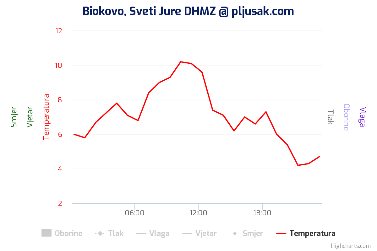 Dotok sve hladnijeg zraka nastavio se u večernjim satima pa je na Svetom Juri na Biokovu večeras izmjereno svega 4 Celzijeva stupnja.