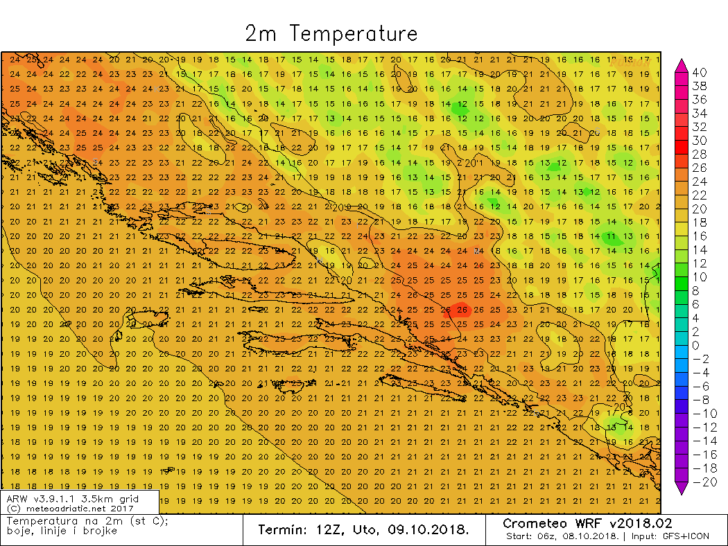Utorak donosi pretežno sunčano i suho vrijeme u većini predjela, ali su popodne u Zagori i dalje mogući slabi i prolazni pljuskovi. Vjetar slab; noću burin, danju slab maestral. Minimalne jutarnje temperature zraka u Zagori od 8 do 12°C, uz obalu i na otocima od 12 do 17°C. Najviše dnevne temperature od 23 do vrlo toplih 28 Celzijevih stupnjeva.