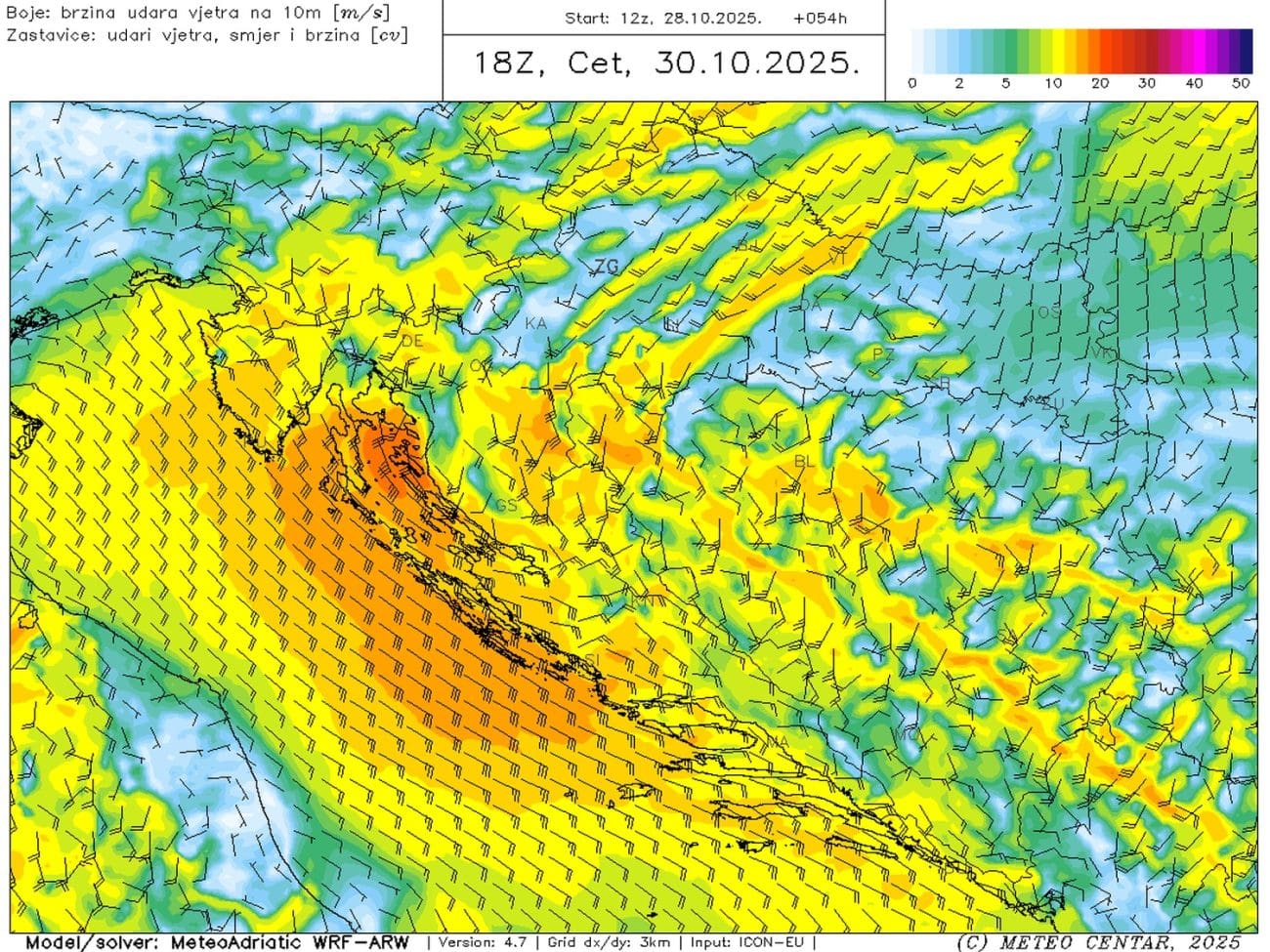 U četvrtak će biti pretežno oblačno. Iako će uglavnom biti suho, povremeno će padati slaba kiša. Puhat će umjeren do jako jugo, slabit će krajem dana i okretati na levant. Jutro osjetno toplije, najviše dnevne temperature od 17 do 22°C.
